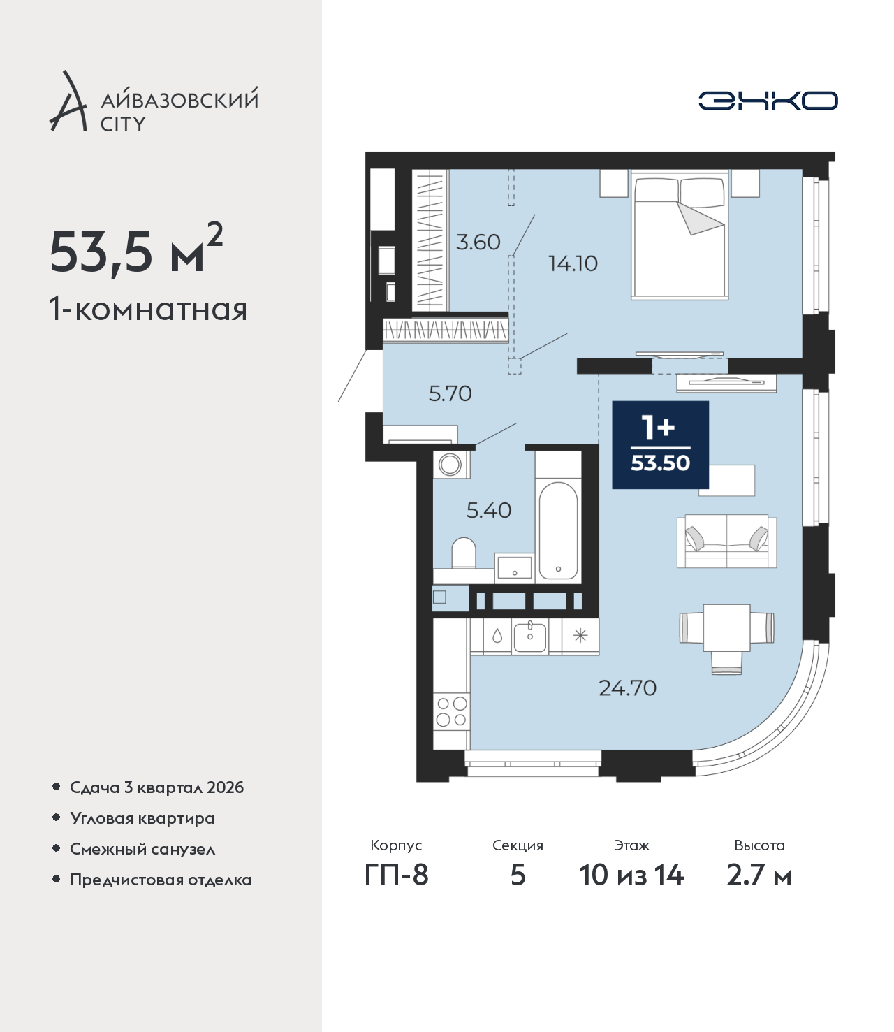 - Общая площадь 53.5 м²