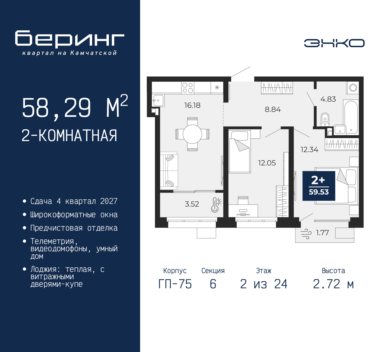 Продается 2-комн. квартира с предчистовой отделкой в ЖК "Беринг" на 2 этаже. Общая площадь: 58.29 кв.м., жилая: 24.39 кв.м., площадь просторной кухни-столовой: 16.18 кв.м. Комнаты изолированные, все окна выходят на одну сторону. В квартире один балкон и одна лоджия, один совмещенный санузел. Высота потолков 2.72 м. Дом монолитный, многоподъездный, переменной этажности, от 17 до 24 этажей. Квартира находится в 6-й секции высотой 24 этажа в корпусе ГП-75. На этаже 6 квартир. В подъезде 2 пассажирских и 1 грузовой лифт. Окончание строительства - 4 квартал 2027 года. Оформление сделки по договору долевого участия. Подобно знаменитому исследователю, мы чувствуем себя первооткрывателями этой локации. Хотим показать новую суть места, сформировать для вас жизненный опыт, которого ещё не было. Беринг — район зелёного цвета. Беринг — район, который откроется вам с другой стороны. Впечатлит новым уровнем комфорта и качеством жизни. Беринг — открытие на карте города. Первый квартал расположен в районе Тура, в границах улиц: Камчатская – Западносибирская – Энтузиастов. Вокруг уже есть всё для того, чтобы ежедневная рутина была лишь частью жизни и не доставляла дискомфорта. Школы и детские сады, магазины и аптеки, поликлиника, места для семейного отдыха, пеших и велопрогулок, и даже рыбалки. Масштабное озеленение дворов — визитная карточка ЭНКО и ваш оазис спокойствия, чтобы отвлечься от повседневности. Раскидистые деревья, кустарники, травы и цветы — осталось остановиться, вдохнуть и расслабиться, глядя на эту природную красоту. Стилистика подъездов продолжает концепцию Беринга, вдохновлённого Камчаткой: сдержанный, но при этом впечатляющий дизайн соседствует с удобством и функциональностью. (AQID02529683)