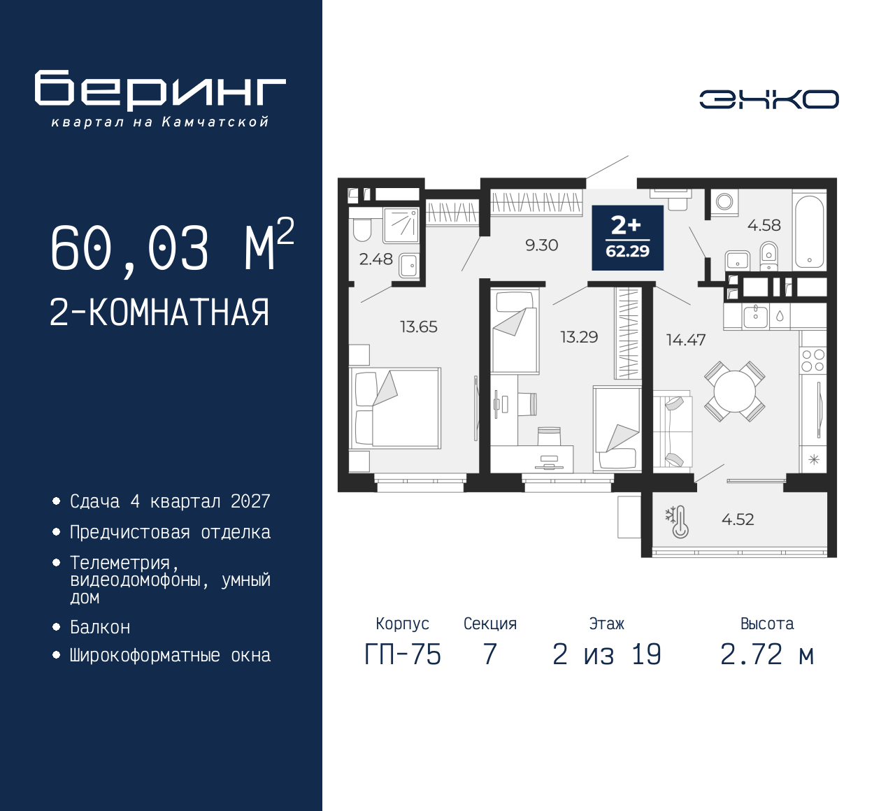 Продается двухкомнатная квартира с предчистовой отделкой в ЖК "Беринг" на 2 этаже. Общая площадь: 60.03 кв.м., жилая: 26.94 кв.м., площадь просторной кухни-столовой: 14.47 кв.м. Комнаты изолированные, все окна выходят на одну сторону. В квартире один балкон, два совмещенных санузла. Высота потолков 2.72 м. Дом монолитный, многоподъездный, переменной этажности, от 17 до 24 этажей. Квартира находится в 7-й секции высотой 19 этажей в корпусе ГП-75. На этаже 7 квартир. В подъезде 2 пассажирских и 1 грузовой лифт. Окончание строительства - 4 квартал 2027 года. Оформление сделки по договору долевого участия. Подобно знаменитому исследователю, мы чувствуем себя первооткрывателями этой локации. Хотим показать новую суть места, сформировать для вас жизненный опыт, которого ещё не было. Беринг — район зелёного цвета. Беринг — район, который откроется вам с другой стороны. Впечатлит новым уровнем комфорта и качеством жизни. Беринг — открытие на карте города. Первый квартал расположен в районе Тура, в границах улиц: Камчатская – Западносибирская – Энтузиастов. Вокруг уже есть всё для того, чтобы ежедневная рутина была лишь частью жизни и не доставляла дискомфорта. Школы и детские сады, магазины и аптеки, поликлиника, места для семейного отдыха, пеших и велопрогулок, и даже рыбалки. Масштабное озеленение дворов — визитная карточка ЭНКО и ваш оазис спокойствия, чтобы отвлечься от повседневности. Раскидистые деревья, кустарники, травы и цветы — осталось остановиться, вдохнуть и расслабиться, глядя на эту природную красоту. Стилистика подъездов продолжает концепцию Беринга, вдохновлённого Камчаткой: сдержанный, но при этом впечатляющий дизайн соседствует с удобством и функциональностью. (AQID02529704)