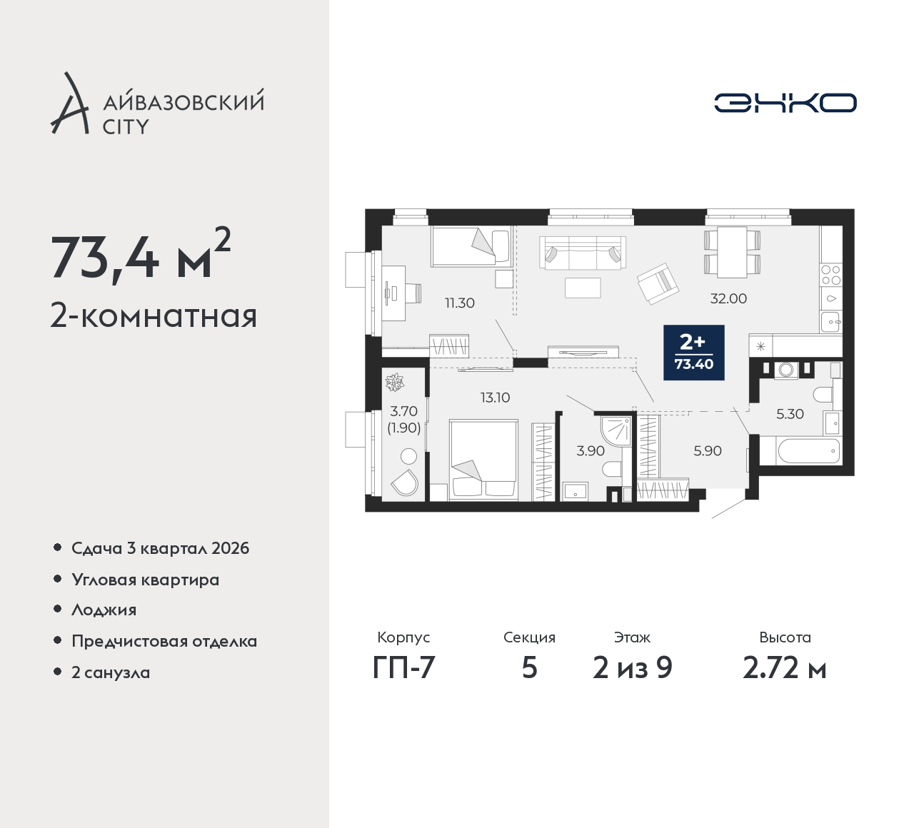 - Общая площадь 73.4 м²