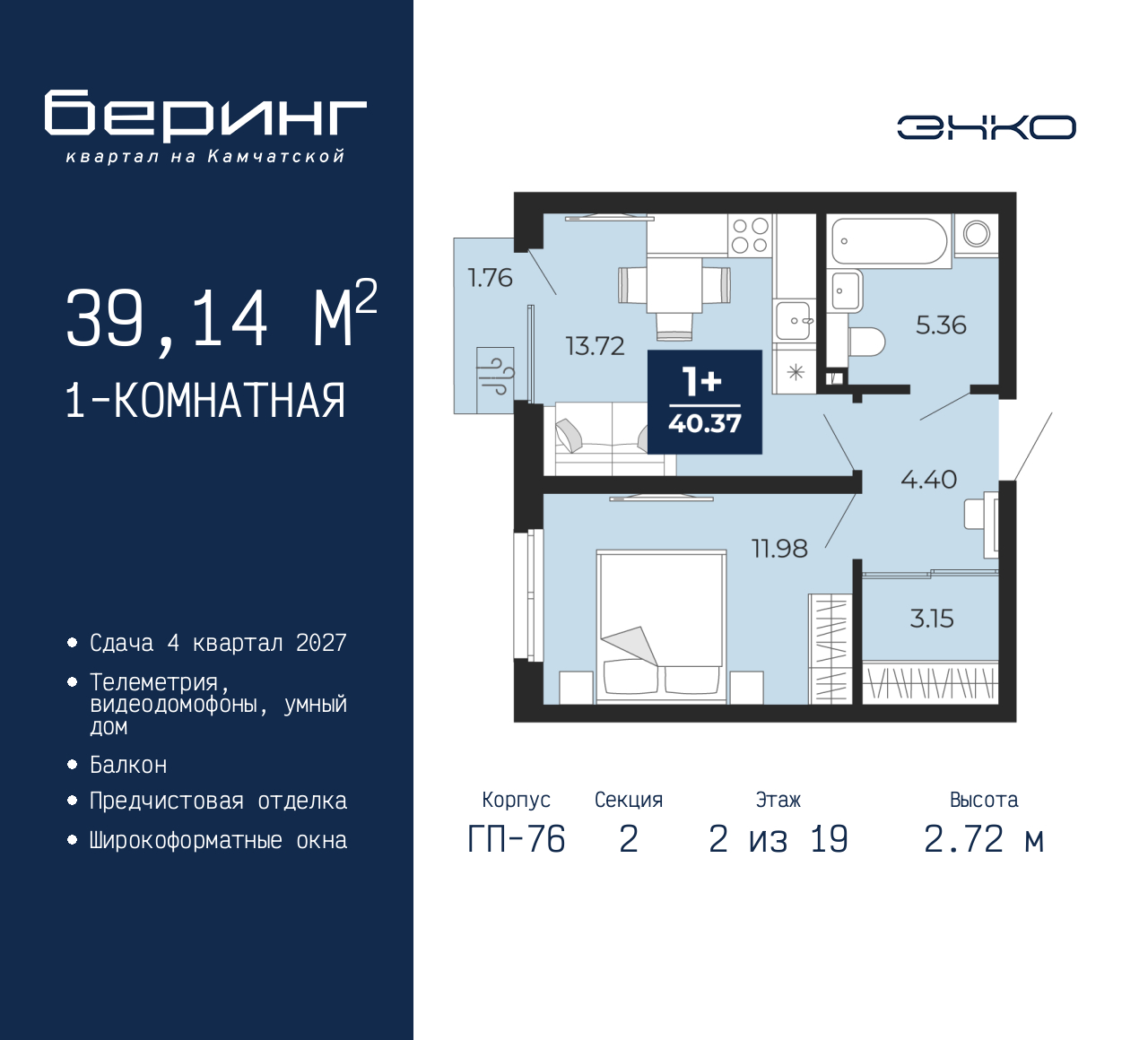 1-комн. квартира от застройщика с предчистовой отделкой в ЖК "Беринг" на 2 этаже. Общая площадь: 39.14 кв.м., жилая: 11.98 кв.м., площадь просторной кухни-столовой: 13.72 кв.м. Все окна выходят на одну сторону. В квартире один балкон, один совмещенный санузел. Высота потолков 2.72 м. Дом монолитный, черырехподъездный, переменной этажности, от 19 до 24 этажей. Квартира находится во 2-й секции высотой 19 этажей в корпусе ГП-76. На этаже 8 квартир. В подъезде 1 пассажирский и 1 грузовой лифт. Окончание строительства - 4 квартал 2027 года. Оформление сделки по договору долевого участия. Подобно знаменитому исследователю, мы чувствуем себя первооткрывателями этой локации. Хотим показать новую суть места, сформировать для вас жизненный опыт, которого ещё не было. Беринг — район зелёного цвета. Беринг — район, который откроется вам с другой стороны. Впечатлит новым уровнем комфорта и качеством жизни. Беринг — открытие на карте города. Первый квартал расположен в районе Тура, в границах улиц: Камчатская – Западносибирская – Энтузиастов. Вокруг уже есть всё для того, чтобы ежедневная рутина была лишь частью жизни и не доставляла дискомфорта. Школы и детские сады, магазины и аптеки, поликлиника, места для семейного отдыха, пеших и велопрогулок, и даже рыбалки. Масштабное озеленение дворов — визитная карточка ЭНКО и ваш оазис спокойствия, чтобы отвлечься от повседневности. Раскидистые деревья, кустарники, травы и цветы — осталось остановиться, вдохнуть и расслабиться, глядя на эту природную красоту. Стилистика подъездов продолжает концепцию Беринга, вдохновлённого Камчаткой: сдержанный, но при этом впечатляющий дизайн соседствует с удобством и функциональностью. (AQID02518043)
