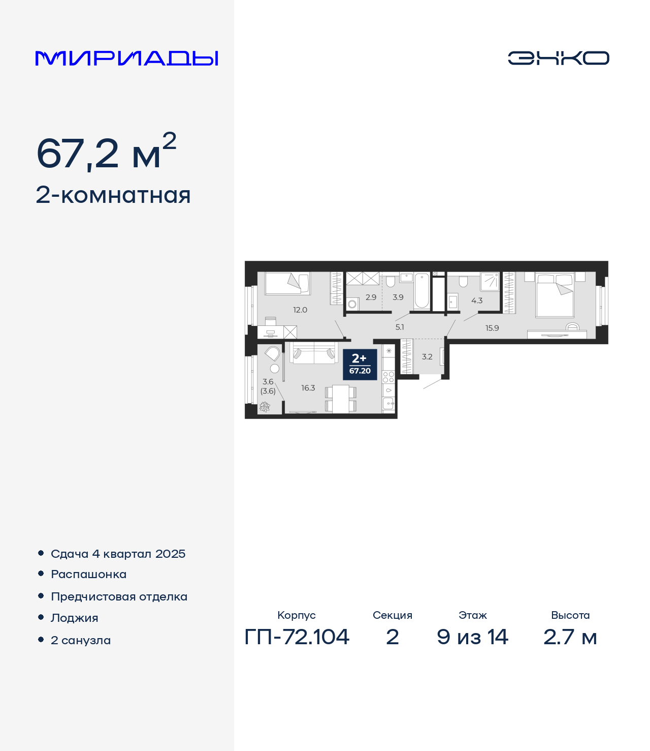 - Общая площадь 67.2 м²