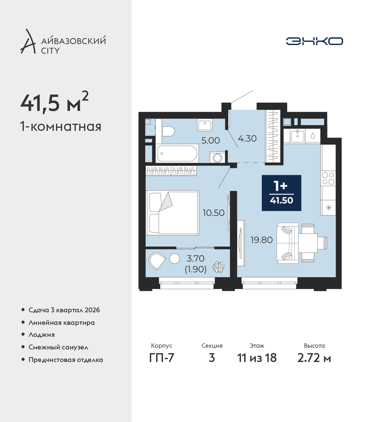 Однокомнатная квартира с предчистовой отделкой в ЖК "Айвазовский City" на 11 этаже. Общая площадь: 41.5 кв.м., жилая: 10.5 кв.м., площадь просторной кухни-столовой: 19.8 кв.м. Все окна выходят на одну сторону. В квартире одна лоджия, один совмещенный санузел. Высота потолков 2.72 м. Дом монолитный, многоподъездный, переменной этажности, от 9 до 24 этажей. Квартира находится в 3-й секции высотой 18 этажей в корпусе ГП-7. На этаже 5 квартир. В подъезде 1 пассажирский и 2 грузовых лифта. Окончание строительства - 3 квартал 2026 года. Оформление сделки по договору долевого участия. Новый жилой район располагается в живописном месте на берегу Туры в центральной части города. Принципиально новое пространство для жизни в центре современного города для тех, чьи мечты сбываются, кто нацелен на постоянный рост, перемены к лучшему для себя и своих близких. Каждая деталь Айвазовский City вдохновляет и заряжает на новые свершения: авторская архитектура, сбалансированная продуманная инфраструктура, дизайнерские дворы со спортивными и детскими площадками, парковые зоны с фонтанами, водный канал, украшающий центральный прогулочный маршрут района и многое другое. В 2019 года проект стал лауреатом престижной премии Urban Awards 2019 в номинации «Лучший строящийся региональный жилой комплекс бизнес-класса». Главная особенность Айвазовский City - соседство разных архитектурных школ в рамках одного дома. Изысканная классика, выразительная эклектика и оригинальный модерн - жить в одном из таких домов настоящий повод для гордости. Айвазовский City это идеальное сочетание комфорта, технологий и развитой инфраструктуры. Вход в подъезд возможен с улицы и со двора. Отправляясь на работу или за покупками, жители могут выйти с внешней стороны дома, а для прогулки с ребенком – со стороны двора. Экологически чистые материалы и энергосберегающие технологии, качественное освещение общественных зон, видеонаблюдение по всей территории жилого района (в том числе в подъездах, лифтах и в подземном паркинге), закрытые дворы с доступом только для жителей Айвазовский City. Часть домов в Айвазовский City будут оснащены подземным паркингом. Востребованный в нашем климатическом поясе формат хранения автомобилей защитит собственность владельца в любое время года. Аккредитация в банках: ПАО «Газпромбанк», ОАО «Альфа-Банк», ПАО Банк «ВТБ», «Сбербанк России», ПАО Банк «ФК Открытие» и других. (AQID02487958)