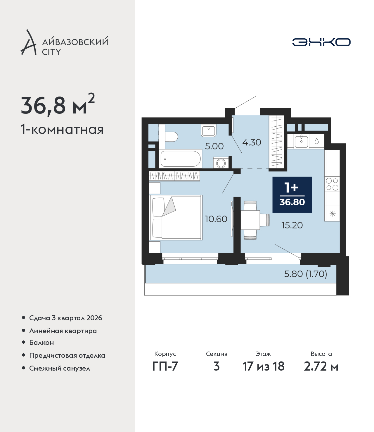 1-комн. квартира от застройщика с предчистовой отделкой в ЖК "Айвазовский City" на 17 этаже. Общая площадь: 36.8 кв.м., жилая: 10.6 кв.м., площадь просторной кухни-столовой: 15.2 кв.м. Все окна выходят на одну сторону. В квартире один балкон, один совмещенный санузел. Высота потолков 2.72 м. Дом монолитный, многоподъездный, переменной этажности, от 9 до 24 этажей. Квартира находится в 3-й секции высотой 18 этажей в корпусе ГП-7. На этаже 5 квартир. В подъезде 1 пассажирский и 2 грузовых лифта. Окончание строительства - 3 квартал 2026 года. Оформление сделки по договору долевого участия. Новый жилой район располагается в живописном месте на берегу Туры в центральной части города. Принципиально новое пространство для жизни в центре современного города для тех, чьи мечты сбываются, кто нацелен на постоянный рост, перемены к лучшему для себя и своих близких. Каждая деталь Айвазовский City вдохновляет и заряжает на новые свершения: авторская архитектура, сбалансированная продуманная инфраструктура, дизайнерские дворы со спортивными и детскими площадками, парковые зоны с фонтанами, водный канал, украшающий центральный прогулочный маршрут района и многое другое. В 2019 года проект стал лауреатом престижной премии Urban Awards 2019 в номинации «Лучший строящийся региональный жилой комплекс бизнес-класса». Главная особенность Айвазовский City - соседство разных архитектурных школ в рамках одного дома. Изысканная классика, выразительная эклектика и оригинальный модерн - жить в одном из таких домов настоящий повод для гордости. Айвазовский City это идеальное сочетание комфорта, технологий и развитой инфраструктуры. Вход в подъезд возможен с улицы и со двора. Отправляясь на работу или за покупками, жители могут выйти с внешней стороны дома, а для прогулки с ребенком – со стороны двора. Экологически чистые материалы и энергосберегающие технологии, качественное освещение общественных зон, видеонаблюдение по всей территории жилого района (в том числе в подъездах, лифтах и в подземном паркинге), закрытые дворы с доступом только для жителей Айвазовский City. Часть домов в Айвазовский City будут оснащены подземным паркингом. Востребованный в нашем климатическом поясе формат хранения автомобилей защитит собственность владельца в любое время года. Аккредитация в банках: ПАО Банк «ВТБ», «Сбербанк России», ОАО «Альфа-Банк», ПАО «Газпромбанк», АО "ДОМ.РФ" и других. (AQID02487965)