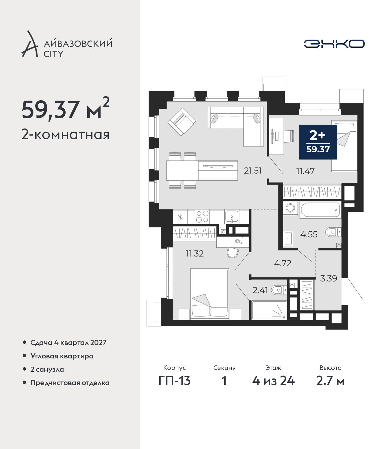 2-комн. квартира с предчистовой отделкой в ЖК "Айвазовский City" на 4 этаже. Общая площадь: 59.37 кв.м., жилая: 22.79 кв.м., площадь просторной кухни-столовой: 21.51 кв.м. Угловая квартира, идеально подойдет любителям тишины и панорамных видов. В квартире два совмещенных санузла. Высота потолков 2.7 м. Дом монолитный, многоподъездный, высотой 24 этажа. Квартира находится в 1-й секции в корпусе ГП-13. На этаже 2 квартиры. Окончание строительства - 4 квартал 2027 года. Оформление сделки по договору долевого участия. Новый жилой район располагается в живописном месте на берегу Туры в центральной части города. Принципиально новое пространство для жизни в центре современного города для тех, чьи мечты сбываются, кто нацелен на постоянный рост, перемены к лучшему для себя и своих близких. Каждая деталь Айвазовский City вдохновляет и заряжает на новые свершения: авторская архитектура, сбалансированная продуманная инфраструктура, дизайнерские дворы со спортивными и детскими площадками, парковые зоны с фонтанами, водный канал, украшающий центральный прогулочный маршрут района и многое другое. В 2019 года проект стал лауреатом престижной премии Urban Awards 2019 в номинации «Лучший строящийся региональный жилой комплекс бизнес-класса». Главная особенность Айвазовский City - соседство разных архитектурных школ в рамках одного дома. Изысканная классика, выразительная эклектика и оригинальный модерн - жить в одном из таких домов настоящий повод для гордости. Айвазовский City это идеальное сочетание комфорта, технологий и развитой инфраструктуры. Вход в подъезд возможен с улицы и со двора. Отправляясь на работу или за покупками, жители могут выйти с внешней стороны дома, а для прогулки с ребенком – со стороны двора. Экологически чистые материалы и энергосберегающие технологии, качественное освещение общественных зон, видеонаблюдение по всей территории жилого района (в том числе в подъездах, лифтах и в подземном паркинге), закрытые дворы с доступом только для жителей Айвазовский City. Часть домов в Айвазовский City будут оснащены подземным паркингом. Востребованный в нашем климатическом поясе формат хранения автомобилей защитит собственность владельца в любое время года. Аккредитация в банках: ПАО «Газпромбанк», ПАО Банк «ВТБ», «Сбербанк России», ОАО «Альфа-Банк», ПАО «Совкомбанк» и других. (AQID02526515)