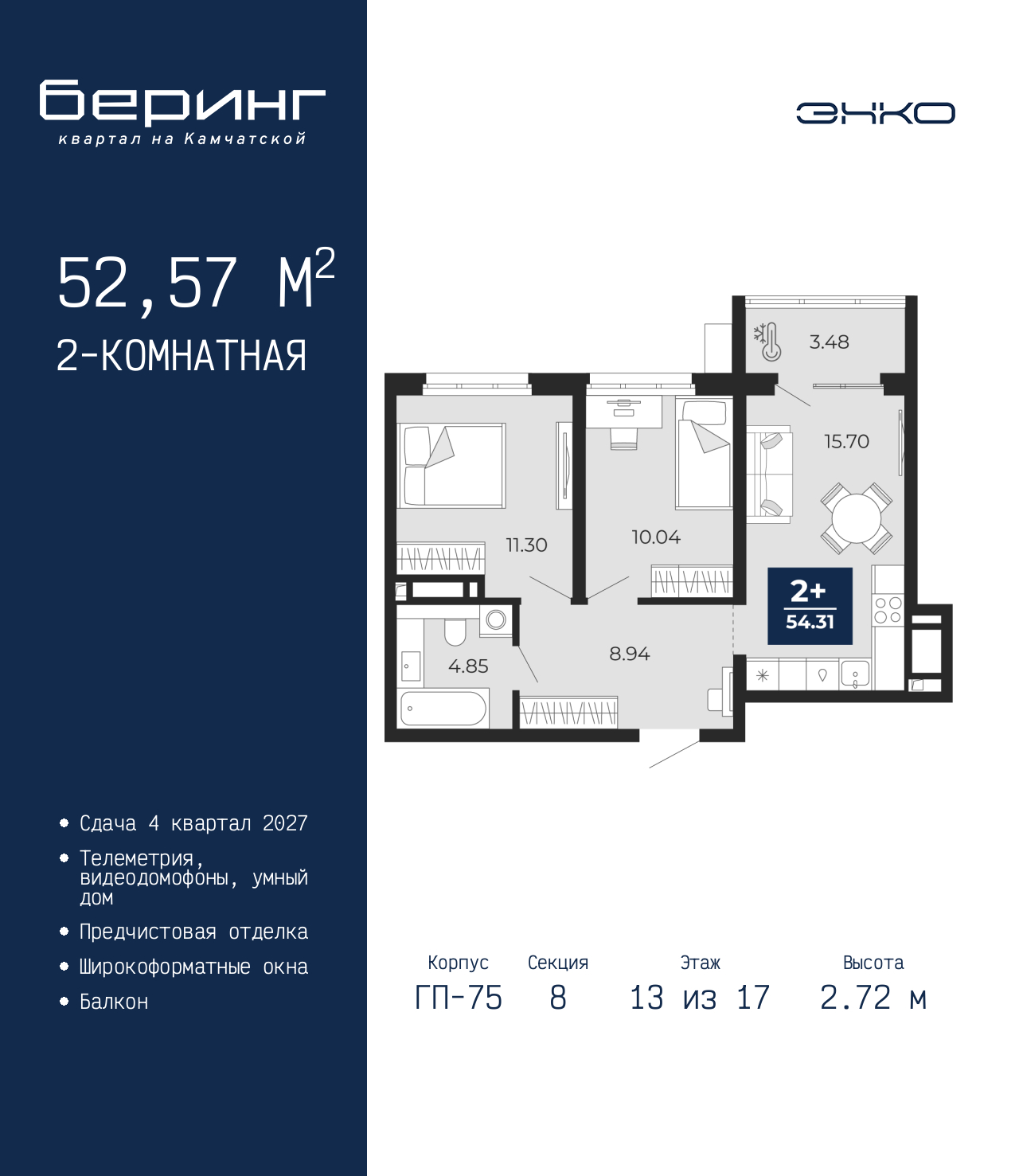 2-комн. квартира от застройщика с предчистовой отделкой в ЖК "Беринг" на 13 этаже. Общая площадь: 52.57 кв.м., жилая: 21.34 кв.м., площадь просторной кухни-столовой: 15.7 кв.м. Комнаты изолированные, все окна выходят на одну сторону. В квартире один балкон, один совмещенный санузел. Высота потолков 2.72 м. Дом монолитный, многоподъездный, переменной этажности, от 17 до 24 этажей. Квартира находится в 8-й секции высотой 17 этажей в корпусе ГП-75. На этаже 8 квартир. В подъезде 2 пассажирских и 1 грузовой лифт. Окончание строительства - 4 квартал 2027 года. Оформление сделки по договору долевого участия. Подобно знаменитому исследователю, мы чувствуем себя первооткрывателями этой локации. Хотим показать новую суть места, сформировать для вас жизненный опыт, которого ещё не было. Беринг — район зелёного цвета. Беринг — район, который откроется вам с другой стороны. Впечатлит новым уровнем комфорта и качеством жизни. Беринг — открытие на карте города. Первый квартал расположен в районе Тура, в границах улиц: Камчатская – Западносибирская – Энтузиастов. Вокруг уже есть всё для того, чтобы ежедневная рутина была лишь частью жизни и не доставляла дискомфорта. Школы и детские сады, магазины и аптеки, поликлиника, места для семейного отдыха, пеших и велопрогулок, и даже рыбалки. Масштабное озеленение дворов — визитная карточка ЭНКО и ваш оазис спокойствия, чтобы отвлечься от повседневности. Раскидистые деревья, кустарники, травы и цветы — осталось остановиться, вдохнуть и расслабиться, глядя на эту природную красоту. Стилистика подъездов продолжает концепцию Беринга, вдохновлённого Камчаткой: сдержанный, но при этом впечатляющий дизайн соседствует с удобством и функциональностью. (AQID02529658)