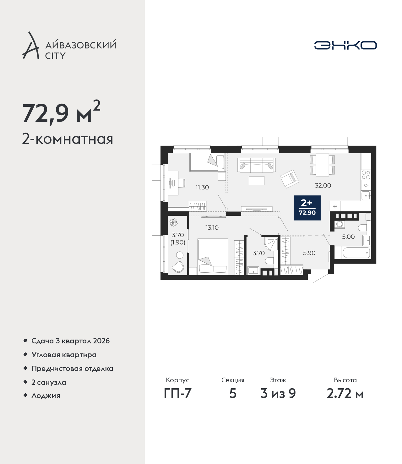 Двухкомнатная квартира от застройщика с предчистовой отделкой в ЖК "Айвазовский City" на 3 этаже. Общая площадь: 72.9 кв.м., жилая: 24.4 кв.м., площадь просторной кухни-столовой: 32 кв.м. Угловая квартира, идеально подойдет любителям тишины и панорамных видов. В квартире одна лоджия, два совмещенных санузла. Высота потолков 2.72 м. Дом монолитный, многоподъездный, переменной этажности, от 9 до 24 этажей. Квартира находится в 5-й секции высотой 9 этажей в корпусе ГП-7. На этаже 7 квартир. В подъезде 1 пассажирский и 2 грузовых лифта. Окончание строительства - 3 квартал 2026 года. Оформление сделки по договору долевого участия. Новый жилой район располагается в живописном месте на берегу Туры в центральной части города. Принципиально новое пространство для жизни в центре современного города для тех, чьи мечты сбываются, кто нацелен на постоянный рост, перемены к лучшему для себя и своих близких. Каждая деталь Айвазовский City вдохновляет и заряжает на новые свершения: авторская архитектура, сбалансированная продуманная инфраструктура, дизайнерские дворы со спортивными и детскими площадками, парковые зоны с фонтанами, водный канал, украшающий центральный прогулочный маршрут района и многое другое. В 2019 года проект стал лауреатом престижной премии Urban Awards 2019 в номинации «Лучший строящийся региональный жилой комплекс бизнес-класса». Главная особенность Айвазовский City - соседство разных архитектурных школ в рамках одного дома. Изысканная классика, выразительная эклектика и оригинальный модерн - жить в одном из таких домов настоящий повод для гордости. Айвазовский City это идеальное сочетание комфорта, технологий и развитой инфраструктуры. Вход в подъезд возможен с улицы и со двора. Отправляясь на работу или за покупками, жители могут выйти с внешней стороны дома, а для прогулки с ребенком – со стороны двора. Экологически чистые материалы и энергосберегающие технологии, качественное освещение общественных зон, видеонаблюдение по всей территории жилого района (в том числе в подъездах, лифтах и в подземном паркинге), закрытые дворы с доступом только для жителей Айвазовский City. Часть домов в Айвазовский City будут оснащены подземным паркингом. Востребованный в нашем климатическом поясе формат хранения автомобилей защитит собственность владельца в любое время года. Аккредитация в банках: ОАО «Альфа-Банк», «Сбербанк России», ПАО Банк «ВТБ», ПАО «Газпромбанк», ПАО «Промсвязьбанк» и других. (AQID02343186)