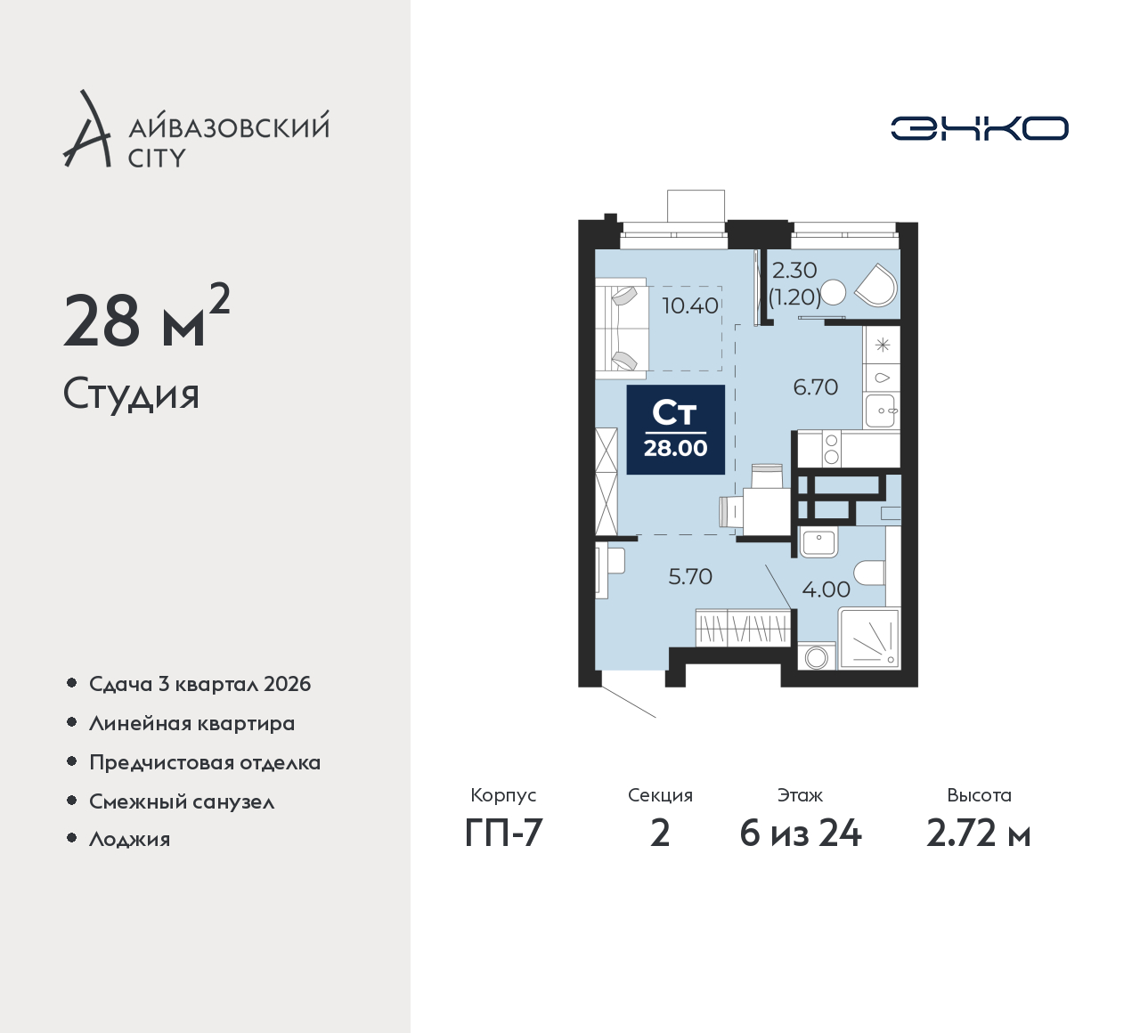 1-комн. квартира-студия от застройщика с предчистовой отделкой в ЖК "Айвазовский City" на 6 этаже. Общая площадь: 28 кв.м., площадь гостиной 17.1 кв.м., из которых 6.7 кв.м. выделено под кухонную зону. Все окна выходят на одну сторону. В квартире одна лоджия, один совмещенный санузел. Высота потолков 2.72 м. Дом монолитный, многоподъездный, переменной этажности, от 9 до 24 этажей. Квартира находится во 2-й секции высотой 24 этажа в корпусе ГП-7. На этаже 7 квартир. В подъезде 1 пассажирский и 2 грузовых лифта. Окончание строительства - 3 квартал 2026 года. Оформление сделки по договору долевого участия. Новый жилой район располагается в живописном месте на берегу Туры в центральной части города. Принципиально новое пространство для жизни в центре современного города для тех, чьи мечты сбываются, кто нацелен на постоянный рост, перемены к лучшему для себя и своих близких. Каждая деталь Айвазовский City вдохновляет и заряжает на новые свершения: авторская архитектура, сбалансированная продуманная инфраструктура, дизайнерские дворы со спортивными и детскими площадками, парковые зоны с фонтанами, водный канал, украшающий центральный прогулочный маршрут района и многое другое. В 2019 года проект стал лауреатом престижной премии Urban Awards 2019 в номинации «Лучший строящийся региональный жилой комплекс бизнес-класса». Главная особенность Айвазовский City - соседство разных архитектурных школ в рамках одного дома. Изысканная классика, выразительная эклектика и оригинальный модерн - жить в одном из таких домов настоящий повод для гордости. Айвазовский City это идеальное сочетание комфорта, технологий и развитой инфраструктуры. Вход в подъезд возможен с улицы и со двора. Отправляясь на работу или за покупками, жители могут выйти с внешней стороны дома, а для прогулки с ребенком – со стороны двора. Экологически чистые материалы и энергосберегающие технологии, качественное освещение общественных зон, видеонаблюдение по всей территории жилого района (в том числе в подъездах, лифтах и в подземном паркинге), закрытые дворы с доступом только для жителей Айвазовский City. Часть домов в Айвазовский City будут оснащены подземным паркингом. Востребованный в нашем климатическом поясе формат хранения автомобилей защитит собственность владельца в любое время года. Аккредитация в банках: ОАО «Альфа-Банк», ПАО «Газпромбанк», ПАО Банк «ВТБ», «Сбербанк России», ПАО «Промсвязьбанк» и других. (AQID02487911)