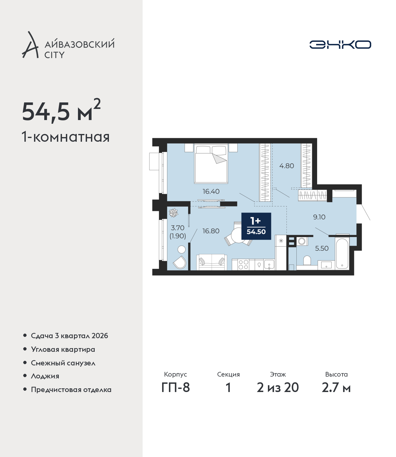 1-комн. квартира с предчистовой отделкой в ЖК "Айвазовский City" на 2 этаже. Общая площадь: 54.5 кв.м., жилая: 17.4 кв.м., площадь просторной кухни-столовой: 21.2 кв.м. Квартира угловая, очень светлая, естественная вентиляция при открытии окон. В квартире одна лоджия, один совмещенный санузел. Высота потолков 2.7 м. Дом монолитный, многоподъездный, переменной этажности, от 14 до 24 этажей. Квартира находится в 1-й секции высотой 20 этажей в корпусе ГП-8. На этаже 6 квартир. В подъезде 1 пассажирский и 1 грузовой лифт. Окончание строительства - 3 квартал 2026 года. Оформление сделки по договору долевого участия. Новый жилой район располагается в живописном месте на берегу Туры в центральной части города. Принципиально новое пространство для жизни в центре современного города для тех, чьи мечты сбываются, кто нацелен на постоянный рост, перемены к лучшему для себя и своих близких. Каждая деталь Айвазовский City вдохновляет и заряжает на новые свершения: авторская архитектура, сбалансированная продуманная инфраструктура, дизайнерские дворы со спортивными и детскими площадками, парковые зоны с фонтанами, водный канал, украшающий центральный прогулочный маршрут района и многое другое. В 2019 года проект стал лауреатом престижной премии Urban Awards 2019 в номинации «Лучший строящийся региональный жилой комплекс бизнес-класса». Главная особенность Айвазовский City - соседство разных архитектурных школ в рамках одного дома. Изысканная классика, выразительная эклектика и оригинальный модерн - жить в одном из таких домов настоящий повод для гордости. Айвазовский City это идеальное сочетание комфорта, технологий и развитой инфраструктуры. Вход в подъезд возможен с улицы и со двора. Отправляясь на работу или за покупками, жители могут выйти с внешней стороны дома, а для прогулки с ребенком – со стороны двора. Экологически чистые материалы и энергосберегающие технологии, качественное освещение общественных зон, видеонаблюдение по всей территории жилого района (в том числе в подъездах, лифтах и в подземном паркинге), закрытые дворы с доступом только для жителей Айвазовский City. Часть домов в Айвазовский City будут оснащены подземным паркингом. Востребованный в нашем климатическом поясе формат хранения автомобилей защитит собственность владельца в любое время года. Аккредитация в банках: ПАО «Газпромбанк», ПАО Банк «ВТБ», ОАО «Альфа-Банк», «Сбербанк России», АО "ДОМ.РФ" и других. (AQID02487988)