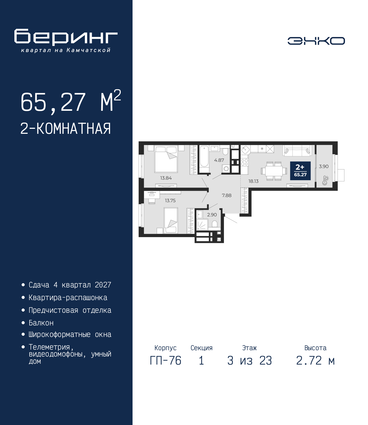 2-комн. квартира от застройщика с предчистовой отделкой в ЖК "Беринг" на 3 этаже. Общая площадь: 65.27 кв.м., жилая: 27.59 кв.м., площадь просторной кухни-столовой: 18.13 кв.м. Квартира - распашонка, без проходных комнат, окна выходят на paзные стороны дома. В квартире один балкон, два совмещенных санузла. Высота потолков 2.72 м. Дом монолитный, черырехподъездный, переменной этажности, от 19 до 24 этажей. Квартира находится в 1-й секции высотой 23 этажа в корпусе ГП-76. На этаже 7 квартир. В подъезде 2 пассажирских и 1 грузовой лифт. Окончание строительства - 4 квартал 2027 года. Оформление сделки по договору долевого участия. Подобно знаменитому исследователю, мы чувствуем себя первооткрывателями этой локации. Хотим показать новую суть места, сформировать для вас жизненный опыт, которого ещё не было. Беринг — район зелёного цвета. Беринг — район, который откроется вам с другой стороны. Впечатлит новым уровнем комфорта и качеством жизни. Беринг — открытие на карте города. Первый квартал расположен в районе Тура, в границах улиц: Камчатская – Западносибирская – Энтузиастов. Вокруг уже есть всё для того, чтобы ежедневная рутина была лишь частью жизни и не доставляла дискомфорта. Школы и детские сады, магазины и аптеки, поликлиника, места для семейного отдыха, пеших и велопрогулок, и даже рыбалки. Масштабное озеленение дворов — визитная карточка ЭНКО и ваш оазис спокойствия, чтобы отвлечься от повседневности. Раскидистые деревья, кустарники, травы и цветы — осталось остановиться, вдохнуть и расслабиться, глядя на эту природную красоту. Стилистика подъездов продолжает концепцию Беринга, вдохновлённого Камчаткой: сдержанный, но при этом впечатляющий дизайн соседствует с удобством и функциональностью. (AQID02517927)