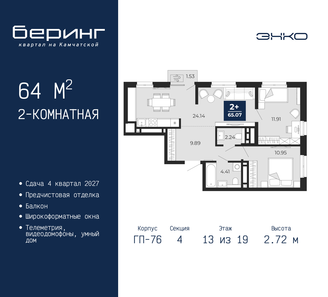Двухкомнатная квартира с предчистовой отделкой в ЖК "Беринг" на 13 этаже. Общая площадь: 64 кв.м., жилая: 22.86 кв.м., площадь просторной кухни-столовой: 24.14 кв.м. Квартира угловая, идеально подойдет любителям тишины и панорамных видов. В квартире один балкон, один совмещенный и один раздельный санузел. Высота потолков 2.72 м. Дом монолитный, черырехподъездный, переменной этажности, от 19 до 24 этажей. Квартира находится в 4-й секции высотой 19 этажей в корпусе ГП-76. На этаже 5 квартир. В подъезде 1 пассажирский и 1 грузовой лифт. Окончание строительства - 4 квартал 2027 года. Оформление сделки по договору долевого участия. Подобно знаменитому исследователю, мы чувствуем себя первооткрывателями этой локации. Хотим показать новую суть места, сформировать для вас жизненный опыт, которого ещё не было. Беринг — район зелёного цвета. Беринг — район, который откроется вам с другой стороны. Впечатлит новым уровнем комфорта и качеством жизни. Беринг — открытие на карте города. Первый квартал расположен в районе Тура, в границах улиц: Камчатская – Западносибирская – Энтузиастов. Вокруг уже есть всё для того, чтобы ежедневная рутина была лишь частью жизни и не доставляла дискомфорта. Школы и детские сады, магазины и аптеки, поликлиника, места для семейного отдыха, пеших и велопрогулок, и даже рыбалки. Масштабное озеленение дворов — визитная карточка ЭНКО и ваш оазис спокойствия, чтобы отвлечься от повседневности. Раскидистые деревья, кустарники, травы и цветы — осталось остановиться, вдохнуть и расслабиться, глядя на эту природную красоту. Стилистика подъездов продолжает концепцию Беринга, вдохновлённого Камчаткой: сдержанный, но при этом впечатляющий дизайн соседствует с удобством и функциональностью. (AQID02518368)