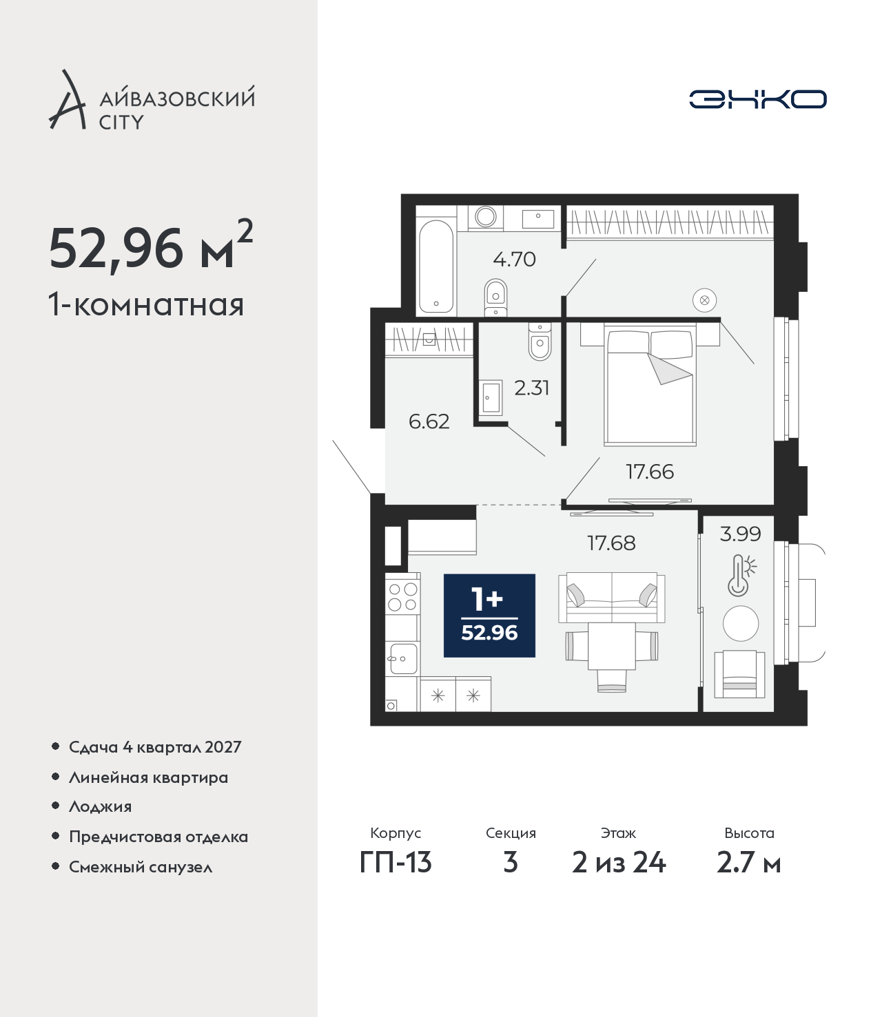 1-комн. квартира с предчистовой отделкой в ЖК "Айвазовский City" на 2 этаже. Общая площадь: 52.96 кв.м., жилая: 17.66 кв.м., площадь просторной кухни-столовой: 17.68 кв.м. Все окна выходят на одну сторону. В квартире одна лоджия, один совмещенный санузел. Высота потолков 2.7 м. Дом монолитный, многоподъездный, высотой 24 этажа. Квартира находится в 3-й секции в корпусе ГП-13. На этаже 9 квартир. В подъезде 1 пассажирский и 1 грузовой лифт. Окончание строительства - 4 квартал 2027 года. Оформление сделки по договору долевого участия. Новый жилой район располагается в живописном месте на берегу Туры в центральной части города. Принципиально новое пространство для жизни в центре современного города для тех, чьи мечты сбываются, кто нацелен на постоянный рост, перемены к лучшему для себя и своих близких. Каждая деталь Айвазовский City вдохновляет и заряжает на новые свершения: авторская архитектура, сбалансированная продуманная инфраструктура, дизайнерские дворы со спортивными и детскими площадками, парковые зоны с фонтанами, водный канал, украшающий центральный прогулочный маршрут района и многое другое. В 2019 года проект стал лауреатом престижной премии Urban Awards 2019 в номинации «Лучший строящийся региональный жилой комплекс бизнес-класса». Главная особенность Айвазовский City - соседство разных архитектурных школ в рамках одного дома. Изысканная классика, выразительная эклектика и оригинальный модерн - жить в одном из таких домов настоящий повод для гордости. Айвазовский City это идеальное сочетание комфорта, технологий и развитой инфраструктуры. Вход в подъезд возможен с улицы и со двора. Отправляясь на работу или за покупками, жители могут выйти с внешней стороны дома, а для прогулки с ребенком – со стороны двора. Экологически чистые материалы и энергосберегающие технологии, качественное освещение общественных зон, видеонаблюдение по всей территории жилого района (в том числе в подъездах, лифтах и в подземном паркинге), закрытые дворы с доступом только для жителей Айвазовский City. Часть домов в Айвазовский City будут оснащены подземным паркингом. Востребованный в нашем климатическом поясе формат хранения автомобилей защитит собственность владельца в любое время года. Аккредитация в банках: ПАО «Газпромбанк», ОАО «Альфа-Банк», «Сбербанк России», ПАО Банк «ВТБ», ПАО «Совкомбанк» и других. (AQID02521063)