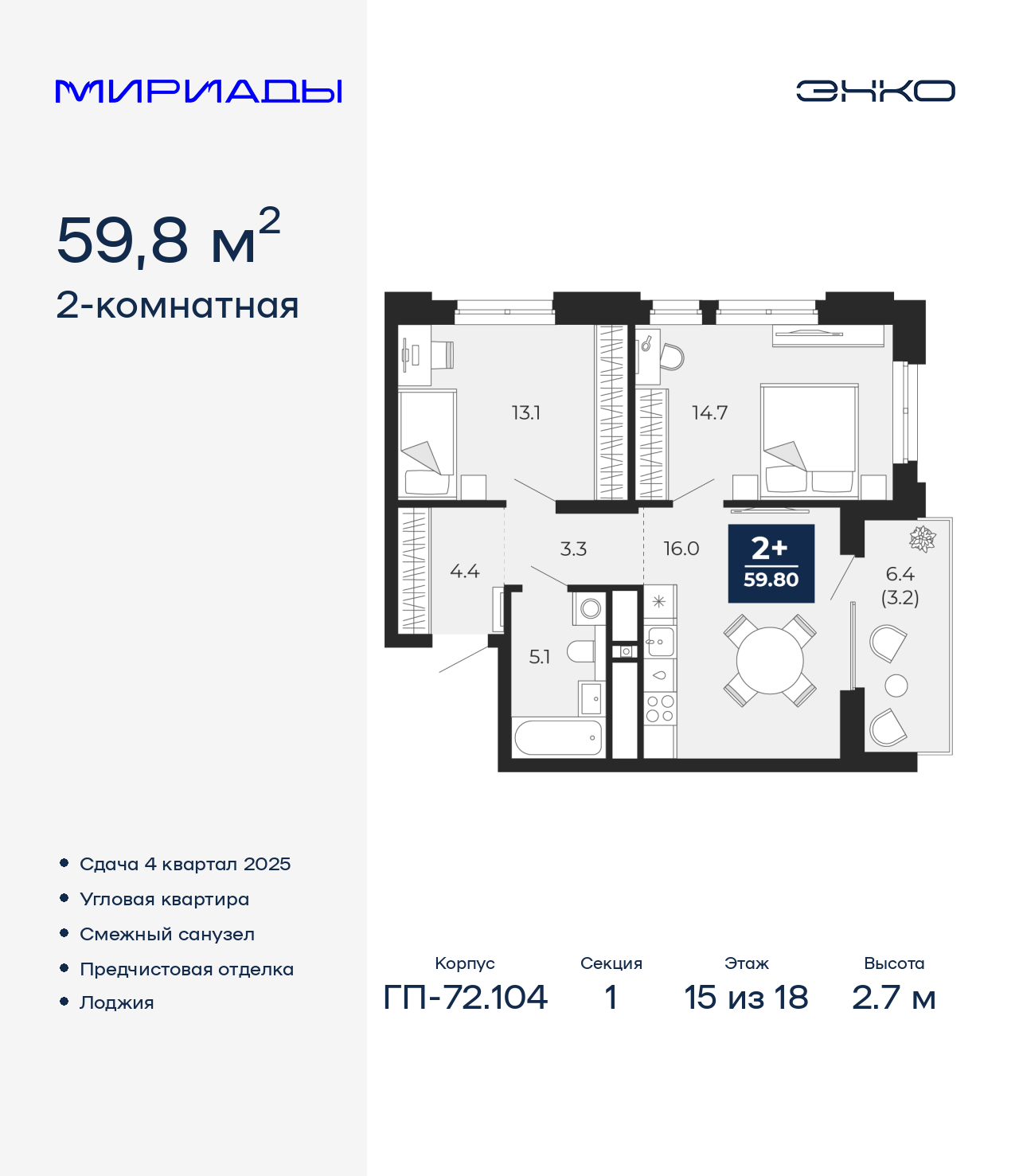 Продается двухкомнатная квартира с предчистовой отделкой в ЖК "Мириады" на 15 этаже. Общая площадь: 59.8 кв.м., жилая: 27.8 кв.м., площадь просторной кухни-столовой: 16 кв.м. Угловая квартира, очень светлая, естественная вентиляция при открытии окон. В квартире одна лоджия, один совмещенный санузел. Высота потолков 2.7 м. Дом монолитный, двухподъездный, переменной этажности, от 14 до 18 этажей. Квартира находится в 1-й секции высотой 18 этажей в корпусе ГП-72.104. На этаже 6 квартир. В подъезде 1 пассажирский и 1 грузовой лифт. Окончание строительства - 4 квартал 2025 года. Оформление сделки по договору долевого участия. Вселенная бесконечных историй. Ранее невиданный Тюмени масштаб: территория 240 гектаров и 1 650 000 м² застройки. Мириады – это город масштабных перемен и больших возможностей. Город зеленых рощ и зеркальных озер. Город для работы, учебы и развлечений. Город для детей и их родителей. Город для всех и каждого. Проект расположен в районе Мыс рядом с ТРЦ «Тюмень Сити Молл» в границах улицы Тимофея Чаркова, Тобольского тракта и объездной дороги. Срок полного освоения территории - до 2034 года. (AQID02522680)