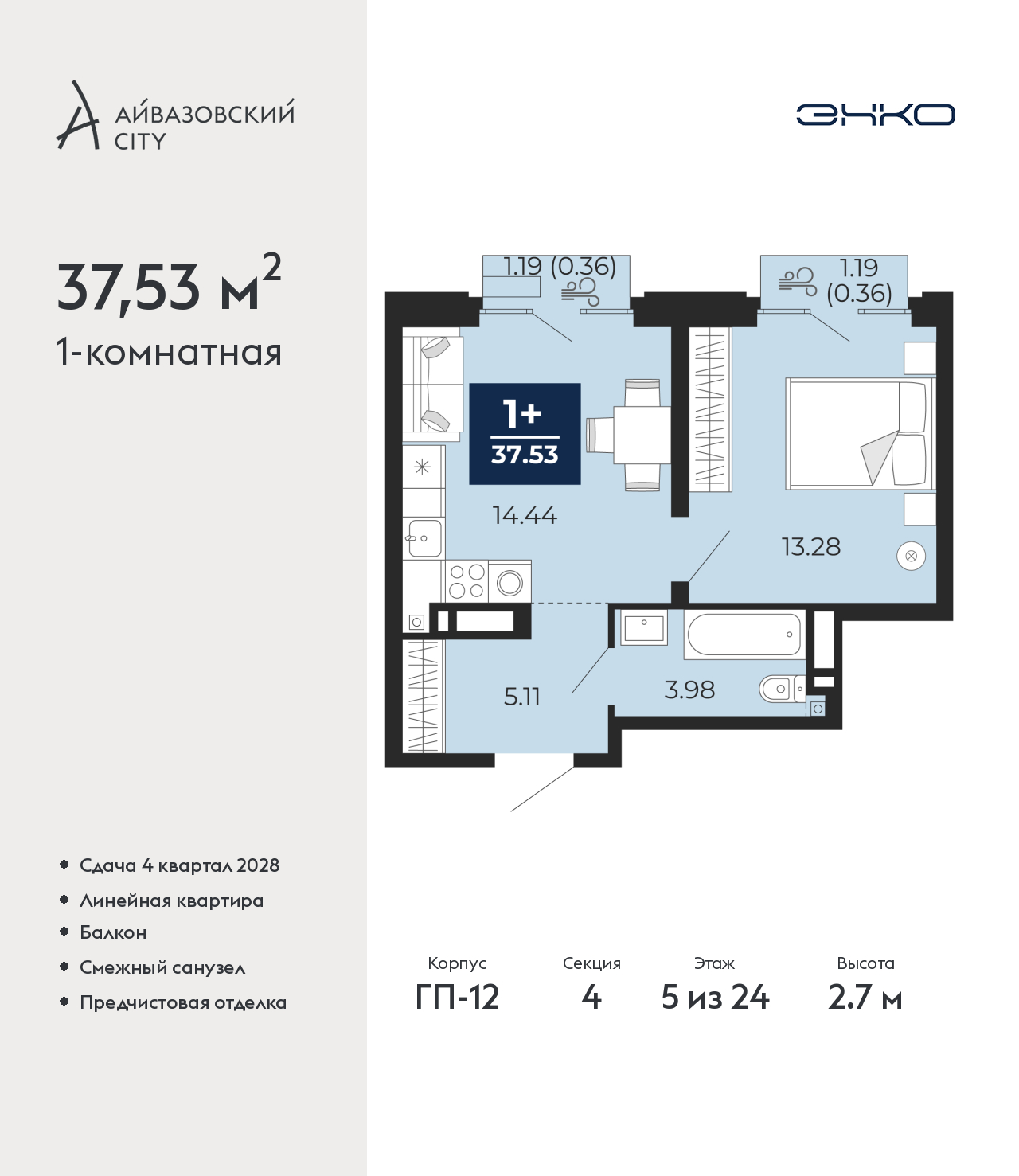 1-комн. квартира от застройщика с предчистовой отделкой в ЖК "Айвазовский City" на 5 этаже. Общая площадь: 37.53 кв.м., жилая: 13.28 кв.м., площадь просторной кухни-столовой: 14.44 кв.м. Все окна выходят на одну сторону. В квартире два балкона, один совмещенный санузел. Высота потолков 2.7 м. Дом монолитный, многоподъездный, высотой 24 этажа. Квартира находится в 4-й секции в корпусе ГП-12. На этаже 5 квартир. В подъезде 1 пассажирский и 1 грузовой лифт. Окончание строительства - 4 квартал 2028 года. Оформление сделки по договору долевого участия. Новый жилой район располагается в живописном месте на берегу Туры в центральной части города. Принципиально новое пространство для жизни в центре современного города для тех, чьи мечты сбываются, кто нацелен на постоянный рост, перемены к лучшему для себя и своих близких. Каждая деталь Айвазовский City вдохновляет и заряжает на новые свершения: авторская архитектура, сбалансированная продуманная инфраструктура, дизайнерские дворы со спортивными и детскими площадками, парковые зоны с фонтанами, водный канал, украшающий центральный прогулочный маршрут района и многое другое. В 2019 года проект стал лауреатом престижной премии Urban Awards 2019 в номинации «Лучший строящийся региональный жилой комплекс бизнес-класса». Главная особенность Айвазовский City - соседство разных архитектурных школ в рамках одного дома. Изысканная классика, выразительная эклектика и оригинальный модерн - жить в одном из таких домов настоящий повод для гордости. Айвазовский City это идеальное сочетание комфорта, технологий и развитой инфраструктуры. Вход в подъезд возможен с улицы и со двора. Отправляясь на работу или за покупками, жители могут выйти с внешней стороны дома, а для прогулки с ребенком – со стороны двора. Экологически чистые материалы и энергосберегающие технологии, качественное освещение общественных зон, видеонаблюдение по всей территории жилого района (в том числе в подъездах, лифтах и в подземном паркинге), закрытые дворы с доступом только для жителей Айвазовский City. Часть домов в Айвазовский City будут оснащены подземным паркингом. Востребованный в нашем климатическом поясе формат хранения автомобилей защитит собственность владельца в любое время года. Аккредитация в банках: «Сбербанк России», ПАО «Газпромбанк», ОАО «Альфа-Банк», ПАО Банк «ВТБ», ПАО Банк «ФК Открытие» и других. (AQID02525606)