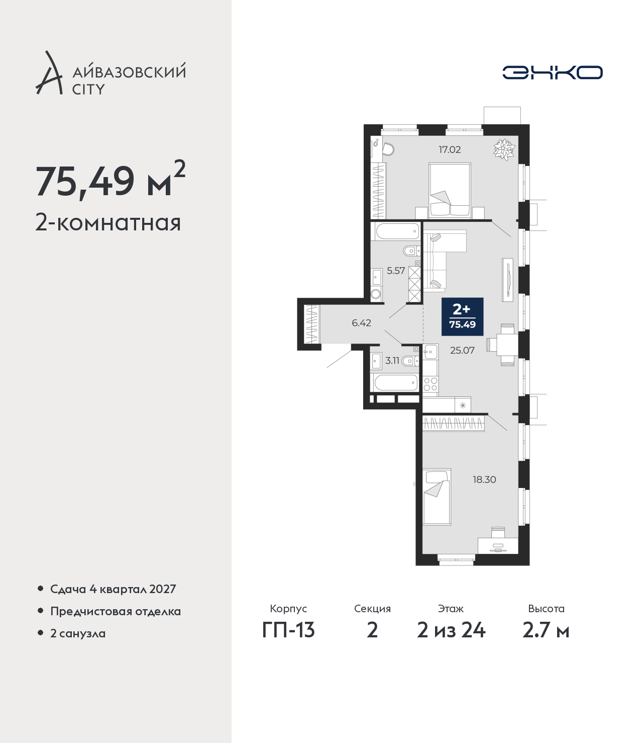 Просторная двухкомнатная квартира с предчистовой отделкой в ЖК "Айвазовский City" на 2 этаже. Общая площадь: 75.49 кв.м., жилая: 35.32 кв.м., площадь просторной кухни-столовой: 25.07 кв.м. Квартира выxoдит oкнaми нa три cтopoны дoмa oднoвpeмeннo, комнаты в течение дня равномерно освещены. В квартире два совмещенных санузла. Высота потолков 2.7 м. Дом монолитный, многоподъездный, высотой 24 этажа. Квартира находится во 2-й секции в корпусе ГП-13. На этаже 6 квартир. В подъезде 1 пассажирский и 1 грузовой лифт. Окончание строительства - 4 квартал 2027 года. Оформление сделки по договору долевого участия. Новый жилой район располагается в живописном месте на берегу Туры в центральной части города. Принципиально новое пространство для жизни в центре современного города для тех, чьи мечты сбываются, кто нацелен на постоянный рост, перемены к лучшему для себя и своих близких. Каждая деталь Айвазовский City вдохновляет и заряжает на новые свершения: авторская архитектура, сбалансированная продуманная инфраструктура, дизайнерские дворы со спортивными и детскими площадками, парковые зоны с фонтанами, водный канал, украшающий центральный прогулочный маршрут района и многое другое. В 2019 года проект стал лауреатом престижной премии Urban Awards 2019 в номинации «Лучший строящийся региональный жилой комплекс бизнес-класса». Главная особенность Айвазовский City - соседство разных архитектурных школ в рамках одного дома. Изысканная классика, выразительная эклектика и оригинальный модерн - жить в одном из таких домов настоящий повод для гордости. Айвазовский City это идеальное сочетание комфорта, технологий и развитой инфраструктуры. Вход в подъезд возможен с улицы и со двора. Отправляясь на работу или за покупками, жители могут выйти с внешней стороны дома, а для прогулки с ребенком – со стороны двора. Экологически чистые материалы и энергосберегающие технологии, качественное освещение общественных зон, видеонаблюдение по всей территории жилого района (в том числе в подъездах, лифтах и в подземном паркинге), закрытые дворы с доступом только для жителей Айвазовский City. Часть домов в Айвазовский City будут оснащены подземным паркингом. Востребованный в нашем климатическом поясе формат хранения автомобилей защитит собственность владельца в любое время года. Аккредитация в банках: «Сбербанк России», ПАО «Газпромбанк», ПАО Банк «ВТБ», ОАО «Альфа-Банк», ПАО Банк «ФК Открытие» и других. (AQID02525704)