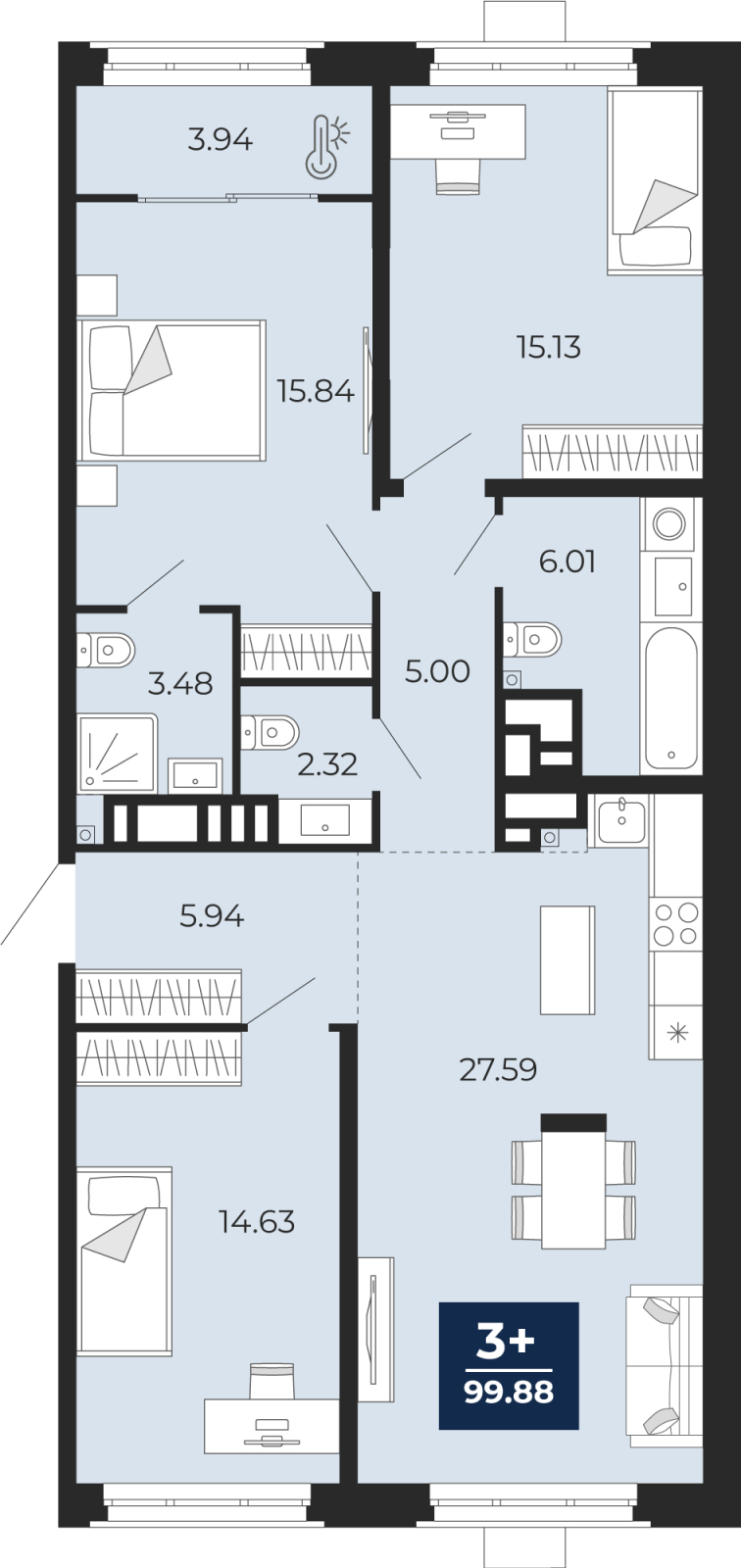 3-комн. квартира с предчистовой отделкой в ЖК "Айвазовский City" на 13 этаже. Общая площадь: 99.88 кв.м., жилая: 45.6 кв.м., площадь просторной кухни-столовой: 27.59 кв.м. Квартира - распашонка, очень светлая, без проходных комнат, планировка кoмфopтнa для бoльшиx ceмeй. В квартире одна лоджия, два совмещенных санузла. Высота потолков 2.7 м. Дом монолитный, многоподъездный, высотой 24 этажа. Квартира находится в 3-й секции в корпусе ГП-12. На этаже 6 квартир. В подъезде 1 пассажирский и 1 грузовой лифт. Окончание строительства - 4 квартал 2028 года. Оформление сделки по договору долевого участия. Новый жилой район располагается в живописном месте на берегу Туры в центральной части города. Принципиально новое пространство для жизни в центре современного города для тех, чьи мечты сбываются, кто нацелен на постоянный рост, перемены к лучшему для себя и своих близких. Каждая деталь Айвазовский City вдохновляет и заряжает на новые свершения: авторская архитектура, сбалансированная продуманная инфраструктура, дизайнерские дворы со спортивными и детскими площадками, парковые зоны с фонтанами, водный канал, украшающий центральный прогулочный маршрут района и многое другое. В 2019 года проект стал лауреатом престижной премии Urban Awards 2019 в номинации «Лучший строящийся региональный жилой комплекс бизнес-класса». Главная особенность Айвазовский City - соседство разных архитектурных школ в рамках одного дома. Изысканная классика, выразительная эклектика и оригинальный модерн - жить в одном из таких домов настоящий повод для гордости. Айвазовский City это идеальное сочетание комфорта, технологий и развитой инфраструктуры. Вход в подъезд возможен с улицы и со двора. Отправляясь на работу или за покупками, жители могут выйти с внешней стороны дома, а для прогулки с ребенком – со стороны двора. Экологически чистые материалы и энергосберегающие технологии, качественное освещение общественных зон, видеонаблюдение по всей территории жилого района (в том числе в подъездах, лифтах и в подземном паркинге), закрытые дворы с доступом только для жителей Айвазовский City. Часть домов в Айвазовский City будут оснащены подземным паркингом. Востребованный в нашем климатическом поясе формат хранения автомобилей защитит собственность владельца в любое время года. Аккредитация в банках: ПАО Банк «ВТБ», «Сбербанк России», ПАО «Газпромбанк», ОАО «Альфа-Банк», АО "ДОМ.РФ" и других. (AQID02525774)