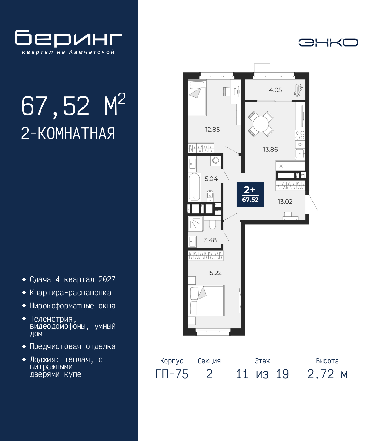 Продается 2-комн. квартира с предчистовой отделкой в ЖК "Беринг" на 11 этаже. Общая площадь: 67.52 кв.м., жилая: 28.07 кв.м., площадь просторной кухни-столовой: 13.86 кв.м. Квартира - распашонка, без проходных комнат, окна выходят на paзные стороны дома. В квартире одна лоджия, два совмещенных санузла. Высота потолков 2.72 м. Дом монолитный, многоподъездный, переменной этажности, от 17 до 24 этажей. Квартира находится во 2-й секции высотой 19 этажей в корпусе ГП-75. На этаже 7 квартир. В подъезде 2 пассажирских и 1 грузовой лифт. Окончание строительства - 4 квартал 2027 года. Оформление сделки по договору долевого участия. Подобно знаменитому исследователю, мы чувствуем себя первооткрывателями этой локации. Хотим показать новую суть места, сформировать для вас жизненный опыт, которого ещё не было. Беринг — район зелёного цвета. Беринг — район, который откроется вам с другой стороны. Впечатлит новым уровнем комфорта и качеством жизни. Беринг — открытие на карте города. Первый квартал расположен в районе Тура, в границах улиц: Камчатская – Западносибирская – Энтузиастов. Вокруг уже есть всё для того, чтобы ежедневная рутина была лишь частью жизни и не доставляла дискомфорта. Школы и детские сады, магазины и аптеки, поликлиника, места для семейного отдыха, пеших и велопрогулок, и даже рыбалки. Масштабное озеленение дворов — визитная карточка ЭНКО и ваш оазис спокойствия, чтобы отвлечься от повседневности. Раскидистые деревья, кустарники, травы и цветы — осталось остановиться, вдохнуть и расслабиться, глядя на эту природную красоту. Стилистика подъездов продолжает концепцию Беринга, вдохновлённого Камчаткой: сдержанный, но при этом впечатляющий дизайн соседствует с удобством и функциональностью. (AQID02532172)