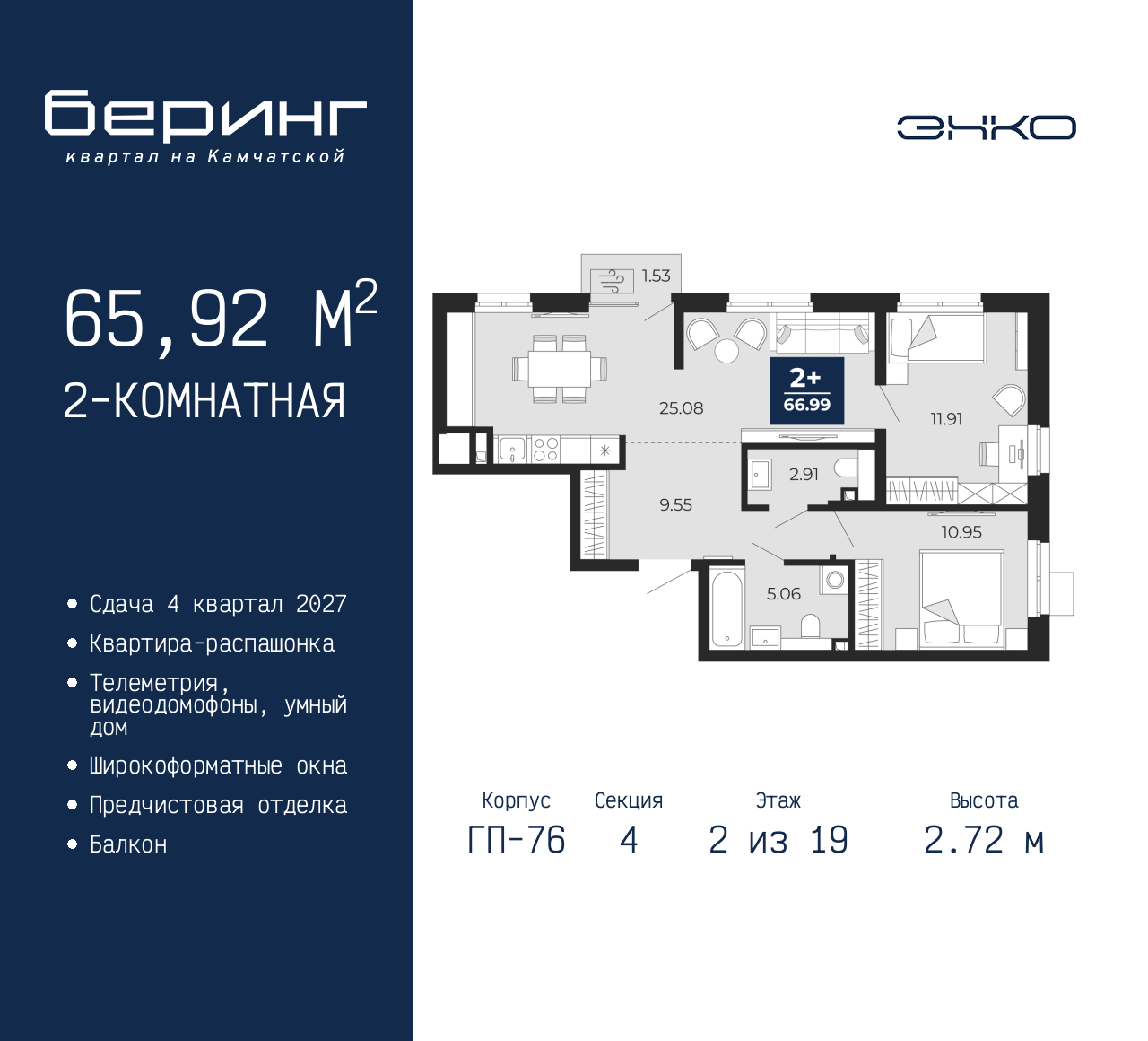 2-комн. квартира с предчистовой отделкой в ЖК "Беринг" на 2 этаже. Общая площадь: 65.92 кв.м., жилая: 25.01 кв.м., площадь просторной кухни-столовой: 21.98 кв.м. Квартира - распашонка, без проходных комнат, окна выходят на paзные стороны дома. В квартире один балкон, два совмещенных санузла. Высота потолков 2.72 м. Дом монолитный, черырехподъездный, переменной этажности, от 19 до 24 этажей. Квартира находится в 4-й секции высотой 19 этажей в корпусе ГП-76. На этаже 5 квартир. В подъезде 1 пассажирский и 1 грузовой лифт. Окончание строительства - 4 квартал 2027 года. Оформление сделки по договору долевого участия. Подобно знаменитому исследователю, мы чувствуем себя первооткрывателями этой локации. Хотим показать новую суть места, сформировать для вас жизненный опыт, которого ещё не было. Беринг — район зелёного цвета. Беринг — район, который откроется вам с другой стороны. Впечатлит новым уровнем комфорта и качеством жизни. Беринг — открытие на карте города. Первый квартал расположен в районе Тура, в границах улиц: Камчатская – Западносибирская – Энтузиастов. Вокруг уже есть всё для того, чтобы ежедневная рутина была лишь частью жизни и не доставляла дискомфорта. Школы и детские сады, магазины и аптеки, поликлиника, места для семейного отдыха, пеших и велопрогулок, и даже рыбалки. Масштабное озеленение дворов — визитная карточка ЭНКО и ваш оазис спокойствия, чтобы отвлечься от повседневности. Раскидистые деревья, кустарники, травы и цветы — осталось остановиться, вдохнуть и расслабиться, глядя на эту природную красоту. Стилистика подъездов продолжает концепцию Беринга, вдохновлённого Камчаткой: сдержанный, но при этом впечатляющий дизайн соседствует с удобством и функциональностью. (AQID02518327)