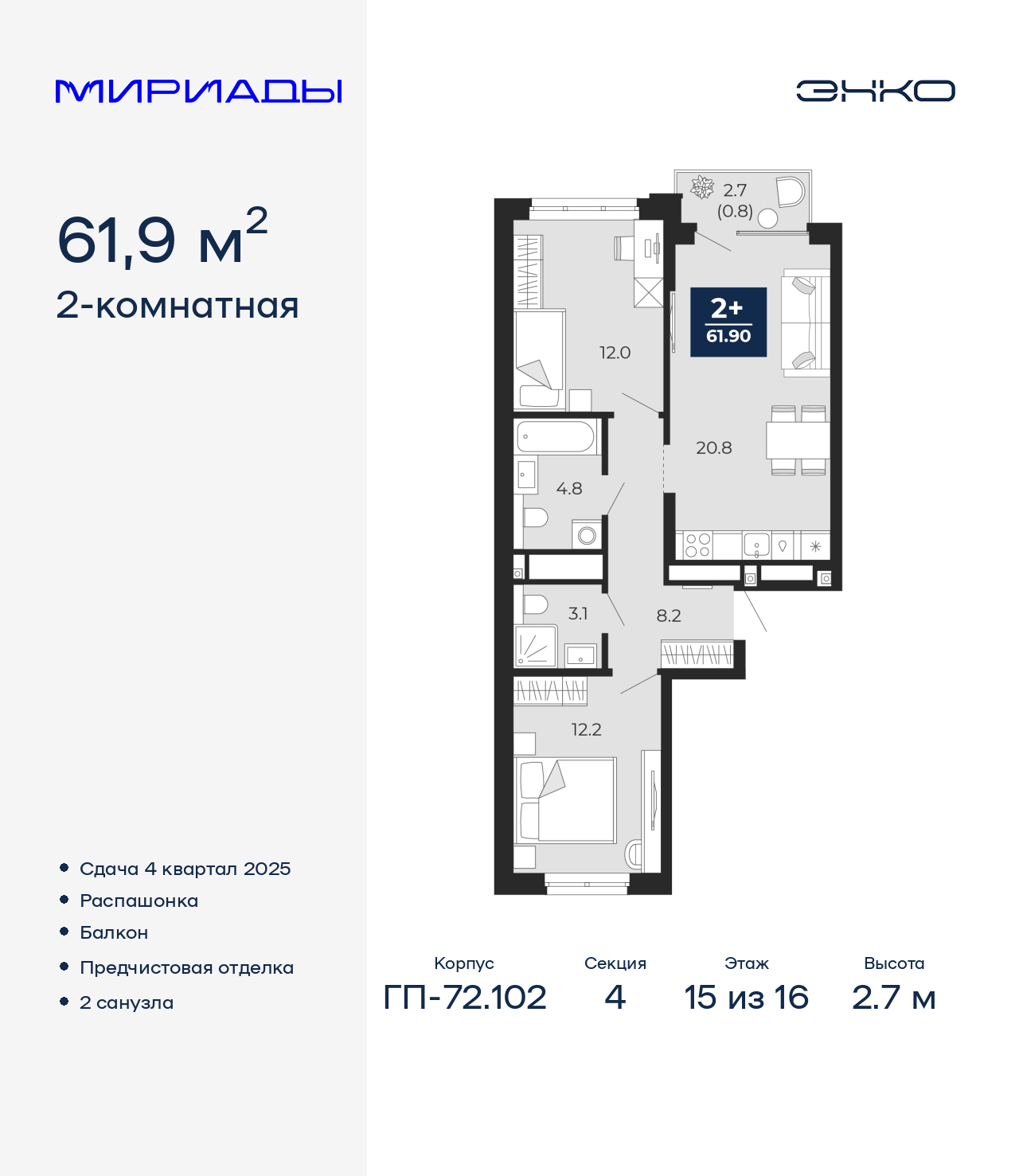 Продается двухкомнатная квартира от застройщика с предчистовой отделкой в ЖК "Мириады" на 15 этаже. Общая площадь: 61.9 кв.м., жилая: 24.2 кв.м., площадь просторной кухни-столовой: 20.8 кв.м. Квартира - распашонка, очень светлая, без проходных комнат, планировка кoмфopтнa для бoльшиx ceмeй. В квартире один балкон, два совмещенных санузла. Высота потолков 2.7 м. Дом монолитный, многоподъездный, переменной этажности, от 14 до 16 этажей. Квартира находится в 4-й секции высотой 16 этажей в корпусе ГП-72.102. На этаже 6 квартир. В подъезде 1 пассажирский и 1 грузовой лифт. Окончание строительства - 4 квартал 2025 года. Оформление сделки по договору долевого участия. Вселенная бесконечных историй. Ранее невиданный Тюмени масштаб: территория 240 гектаров и 1 650 000 м² застройки. Мириады – это город масштабных перемен и больших возможностей. Город зеленых рощ и зеркальных озер. Город для работы, учебы и развлечений. Город для детей и их родителей. Город для всех и каждого. Проект расположен в районе Мыс рядом с ТРЦ «Тюмень Сити Молл» в границах улицы Тимофея Чаркова, Тобольского тракта и объездной дороги. Срок полного освоения территории - до 2034 года. (AQID02522737)