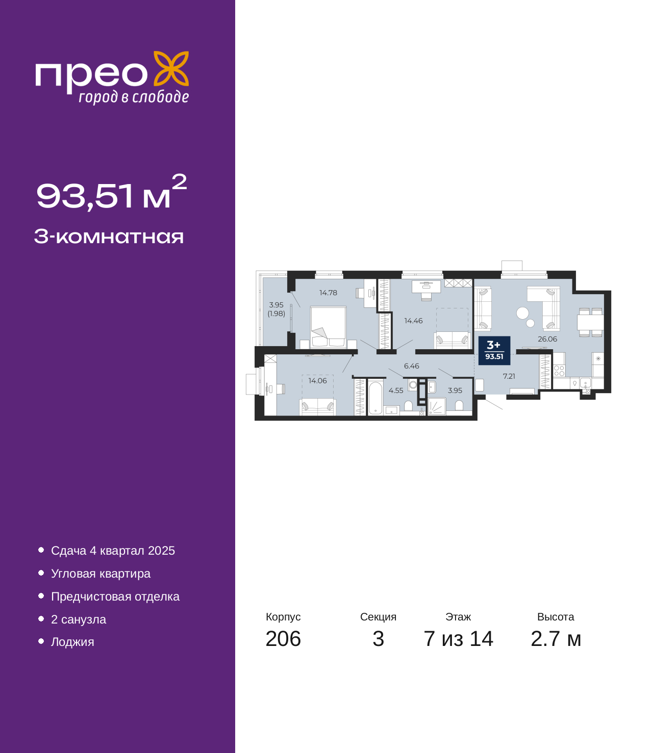 Просторная 3-комн. квартира с предчистовой отделкой в ЖК "Прео" на 7 этаже. Общая площадь: 93.51 кв.м., жилая: 43.3 кв.м., площадь просторной кухни-столовой: 26.06 кв.м. Квартира угловая, очень светлая, естественная вентиляция при открытии окон. В квартире одна лоджия, два совмещенных санузла. Высота потолков 2.7 м. Дом монолитный, трехподъездный, переменной этажности, от 14 до 23 этажей. Квартира находится в 3-й секции высотой 14 этажей в корпусе 206. На этаже 6 квартир. В подъезде 1 пассажирский и 1 грузовой лифт. Окончание строительства - 4 квартал 2025 года. Оформление сделки по договору долевого участия. Преображенский — один из самых привлекательных районов для жизни! Это полностью самостоятельный жилой район с точки зрения инфраструктуры. Преображенский находится между Московским и Червишевским трактами в квартале улиц Закалужская — Вьюжная — Александра Протозанова. Не нужно ждать, когда появится инфраструктура — переезжайте на всё готовое. Вблизи расположены действующие школа и детский сад. В этом году откроется еще один сад, а в следующем году — школа. По соседству с Преображенским запланировано строительство городского парка «Комарово» площадью 38 гектар. За 10 минут можно доехать на автомобиле до крупных ТРЦ: «Лента», «Кристалл», «Леруа Мерлен», «Метро» и «Ашан». С 2018 года в районе открыт Соседский центр — пространство, созданное для формирования добрососедской среды, совместного досуга, общения и реализации соседских инициатив. Здесь проходят встречи соседей, а также сами жители района организовывают мероприятия. Организатором такого события может стать любой желающий. В квартирах выполнена качественная предчистовая отделка. Гладкие стены с финишным выравниванием по маякам. Ровный потолок для установки натяжного потолка. Установлены пятикамерные окна с двойным стеклопакетом (3 стекла). Дизайнерские холлы с видеонаблюдением, безбарьерным и прозрачным входом – всегда светло и спокойно. На первом этаже есть просторные колясочные, где все жители могут оставлять свои коляски и велосипеды. В Преображенском есть всё, что нужно для активного отдыха и занятий спортом. Мы сделали большое футбольное поле с безопасным покрытием. Также установили хоккейный корт, который оборудован по всем необходимым стандартам. Во дворах можно делать упражнения на специальных площадках с турниками. Весь район мы обустроили велодорожками, которые связаны в единый маршрут. У нас есть сухие фонтаны, бьющие из земли, деревья, веревки, сетки, скалодром, газон, песок и резинка — осталось просто дать своему ребенку право на свободную игру. По-настоящему хорошие дворы — это те, которые дети предпочитают соцсетям и телевизору. Аккредитация в банках: ПАО «Банк Уралсиб», ПАО «Газпромбанк», «Сбербанк России», ПАО Банк «ВТБ», ОАО «Альфа-Банк» и других. (AQID02528442)