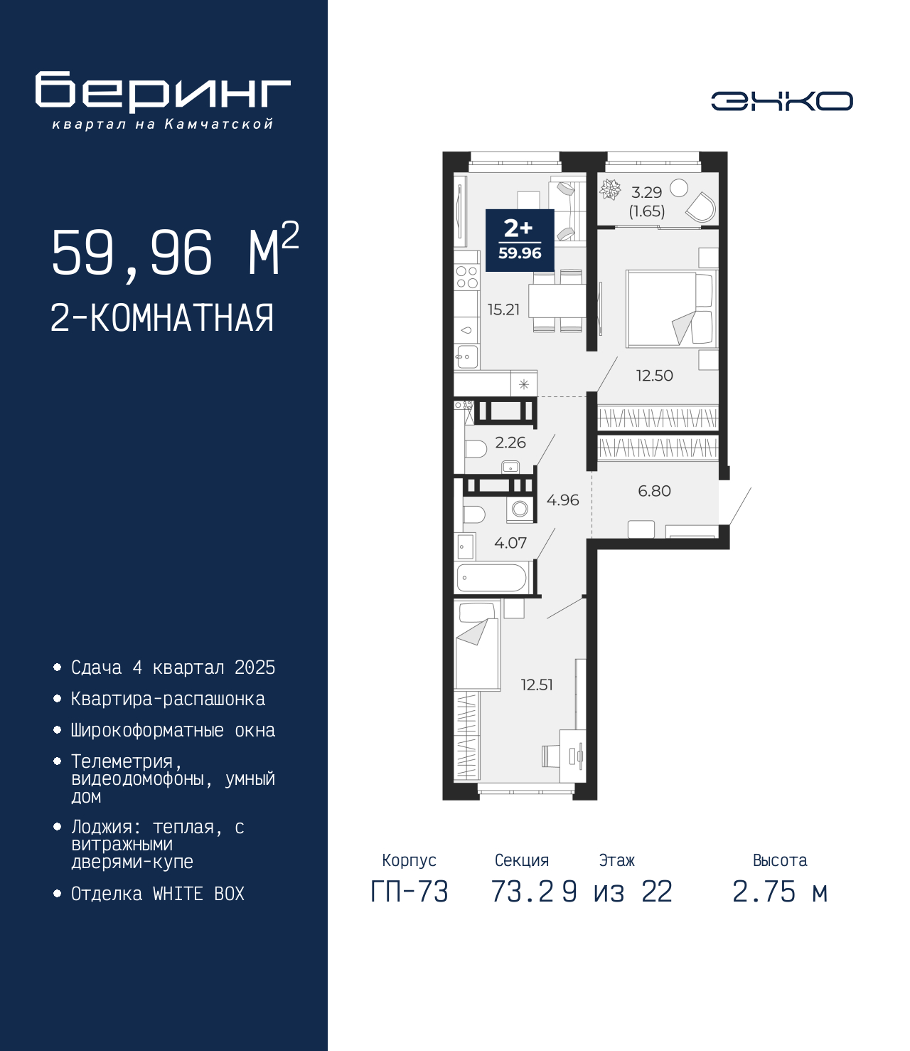 Продается 2-комн. квартира в ЖК "Беринг" на 9 этаже. Квартира без отделки, после выдачи ключей можно делать ремонт. Общая площадь: 59.96 кв.м., жилая: 25.01 кв.м., площадь просторной кухни-столовой: 15.21 кв.м. Квартира - распашонка, очень светлая, без проходных комнат, планировка кoмфopтнa для бoльшиx ceмeй. В квартире одна лоджия, один совмещенный и один раздельный санузел. Высота потолков 2.75 м. Дом монолитный, многоподъездный, переменной этажности, от 9 до 22 этажей. Квартира находится в 73.2-й секции высотой 22 этажа в корпусе ГП-73. На этаже 7 квартир. В подъезде 1 пассажирский и 1 грузовой лифт. Окончание строительства - 4 квартал 2025 года. Оформление сделки по договору долевого участия. Подобно знаменитому исследователю, мы чувствуем себя первооткрывателями этой локации. Хотим показать новую суть места, сформировать для вас жизненный опыт, которого ещё не было. Беринг — район зелёного цвета. Беринг — район, который откроется вам с другой стороны. Впечатлит новым уровнем комфорта и качеством жизни. Беринг — открытие на карте города. Первый квартал расположен в районе Тура, в границах улиц: Камчатская – Западносибирская – Энтузиастов. Вокруг уже есть всё для того, чтобы ежедневная рутина была лишь частью жизни и не доставляла дискомфорта. Школы и детские сады, магазины и аптеки, поликлиника, места для семейного отдыха, пеших и велопрогулок, и даже рыбалки. Масштабное озеленение дворов — визитная карточка ЭНКО и ваш оазис спокойствия, чтобы отвлечься от повседневности. Раскидистые деревья, кустарники, травы и цветы — осталось остановиться, вдохнуть и расслабиться, глядя на эту природную красоту. Стилистика подъездов продолжает концепцию Беринга, вдохновлённого Камчаткой: сдержанный, но при этом впечатляющий дизайн соседствует с удобством и функциональностью. (AQID02529359)