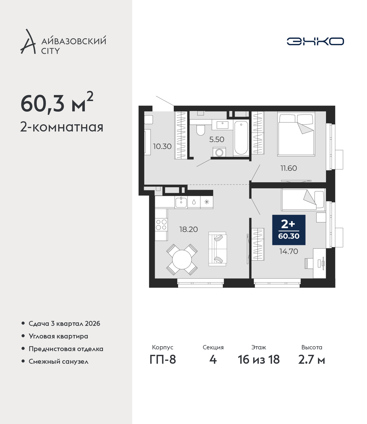 - Общая площадь 60.3 м²