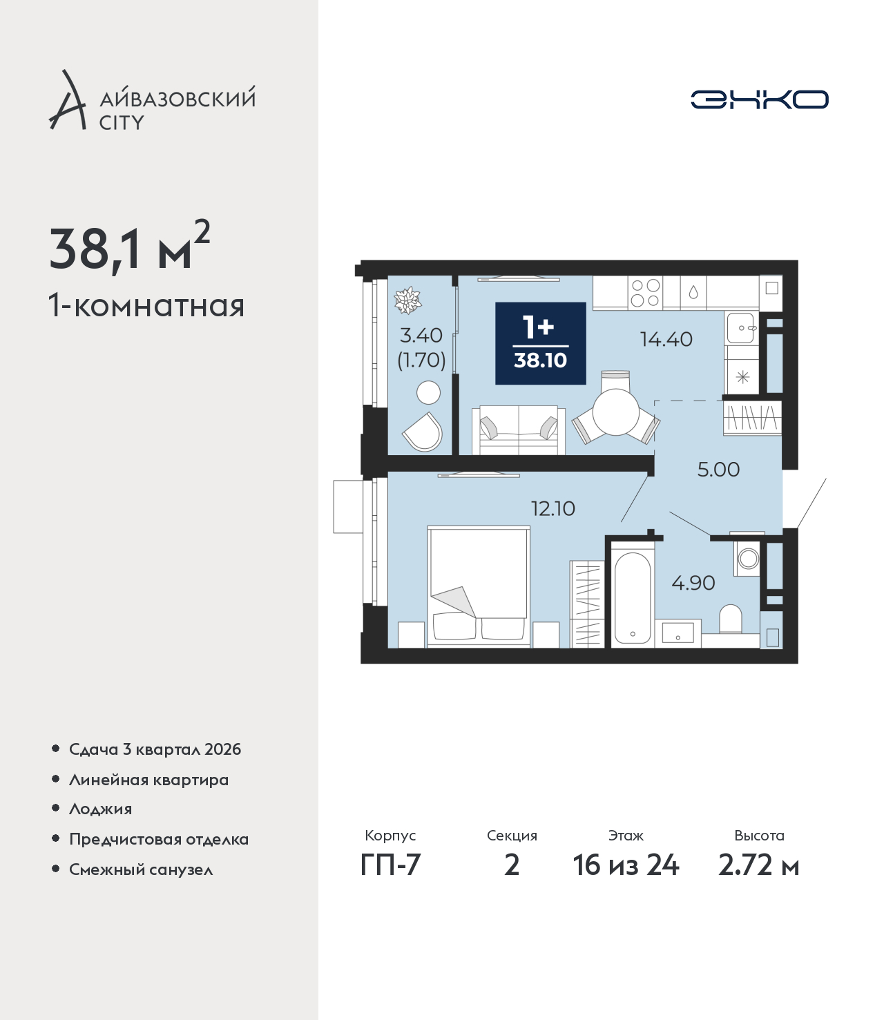 Просторная 1-комн. квартира с предчистовой отделкой в ЖК "Айвазовский City" на 16 этаже. Общая площадь: 38.1 кв.м., жилая: 12.1 кв.м., площадь просторной кухни-столовой: 14.4 кв.м. Все окна выходят на одну сторону. В квартире одна лоджия, один совмещенный санузел. Высота потолков 2.72 м. Дом монолитный, многоподъездный, переменной этажности, от 9 до 24 этажей. Квартира находится во 2-й секции высотой 24 этажа в корпусе ГП-7. На этаже 7 квартир. В подъезде 1 пассажирский и 2 грузовых лифта. Окончание строительства - 3 квартал 2026 года. Оформление сделки по договору долевого участия. Новый жилой район располагается в живописном месте на берегу Туры в центральной части города. Принципиально новое пространство для жизни в центре современного города для тех, чьи мечты сбываются, кто нацелен на постоянный рост, перемены к лучшему для себя и своих близких. Каждая деталь Айвазовский City вдохновляет и заряжает на новые свершения: авторская архитектура, сбалансированная продуманная инфраструктура, дизайнерские дворы со спортивными и детскими площадками, парковые зоны с фонтанами, водный канал, украшающий центральный прогулочный маршрут района и многое другое. В 2019 года проект стал лауреатом престижной премии Urban Awards 2019 в номинации «Лучший строящийся региональный жилой комплекс бизнес-класса». Главная особенность Айвазовский City - соседство разных архитектурных школ в рамках одного дома. Изысканная классика, выразительная эклектика и оригинальный модерн - жить в одном из таких домов настоящий повод для гордости. Айвазовский City это идеальное сочетание комфорта, технологий и развитой инфраструктуры. Вход в подъезд возможен с улицы и со двора. Отправляясь на работу или за покупками, жители могут выйти с внешней стороны дома, а для прогулки с ребенком – со стороны двора. Экологически чистые материалы и энергосберегающие технологии, качественное освещение общественных зон, видеонаблюдение по всей территории жилого района (в том числе в подъездах, лифтах и в подземном паркинге), закрытые дворы с доступом только для жителей Айвазовский City. Часть домов в Айвазовский City будут оснащены подземным паркингом. Востребованный в нашем климатическом поясе формат хранения автомобилей защитит собственность владельца в любое время года. Аккредитация в банках: ОАО «Альфа-Банк», «Сбербанк России», ПАО «Газпромбанк», ПАО Банк «ВТБ», ПАО «Совкомбанк» и других. (AQID02483601)