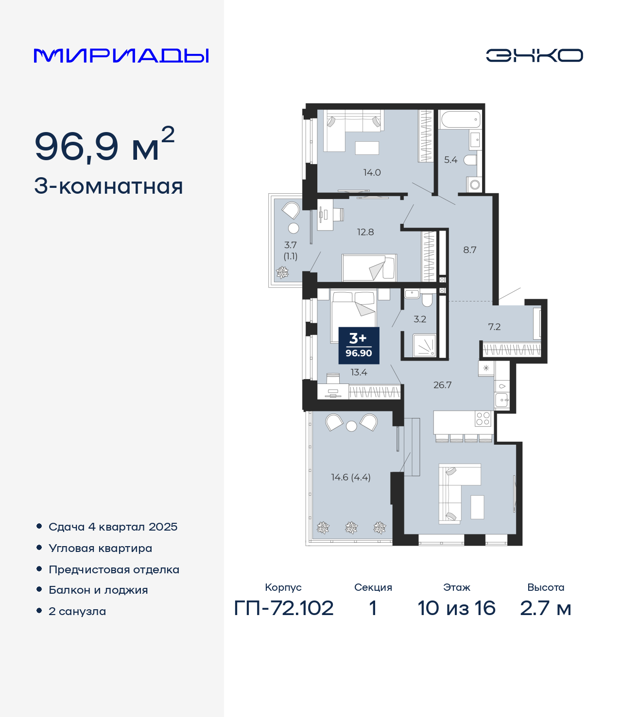 Просторная 3-комн. квартира с предчистовой отделкой в ЖК "Мириады" на 10 этаже. Общая площадь: 96.9 кв.м., жилая: 40.2 кв.м., площадь просторной кухни-столовой: 26.7 кв.м. Квартира угловая, окна oбecпeчивaют paвнoмepнoe ocвeщeниe в тeчeниe дня. В квартире один балкон и одна лоджия, два совмещенных санузла. Наличие в квартире террасы открывает возможность для создания зон отдыха в кругу семьи и друзей. Высота потолков 2.7 м. Дом монолитный, многоподъездный, переменной этажности, от 14 до 16 этажей. Квартира находится в 1-й секции высотой 16 этажей в корпусе ГП-72.102. На этаже 9 квартир. В подъезде 1 пассажирский и 1 грузовой лифт. Окончание строительства - 4 квартал 2025 года. Оформление сделки по договору долевого участия. Вселенная бесконечных историй. Ранее невиданный Тюмени масштаб: территория 240 гектаров и 1 650 000 м² застройки. Мириады – это город масштабных перемен и больших возможностей. Город зеленых рощ и зеркальных озер. Город для работы, учебы и развлечений. Город для детей и их родителей. Город для всех и каждого. Проект расположен в районе Мыс рядом с ТРЦ «Тюмень Сити Молл» в границах улицы Тимофея Чаркова, Тобольского тракта и объездной дороги. Срок полного освоения территории - до 2034 года. (AQID02522759)