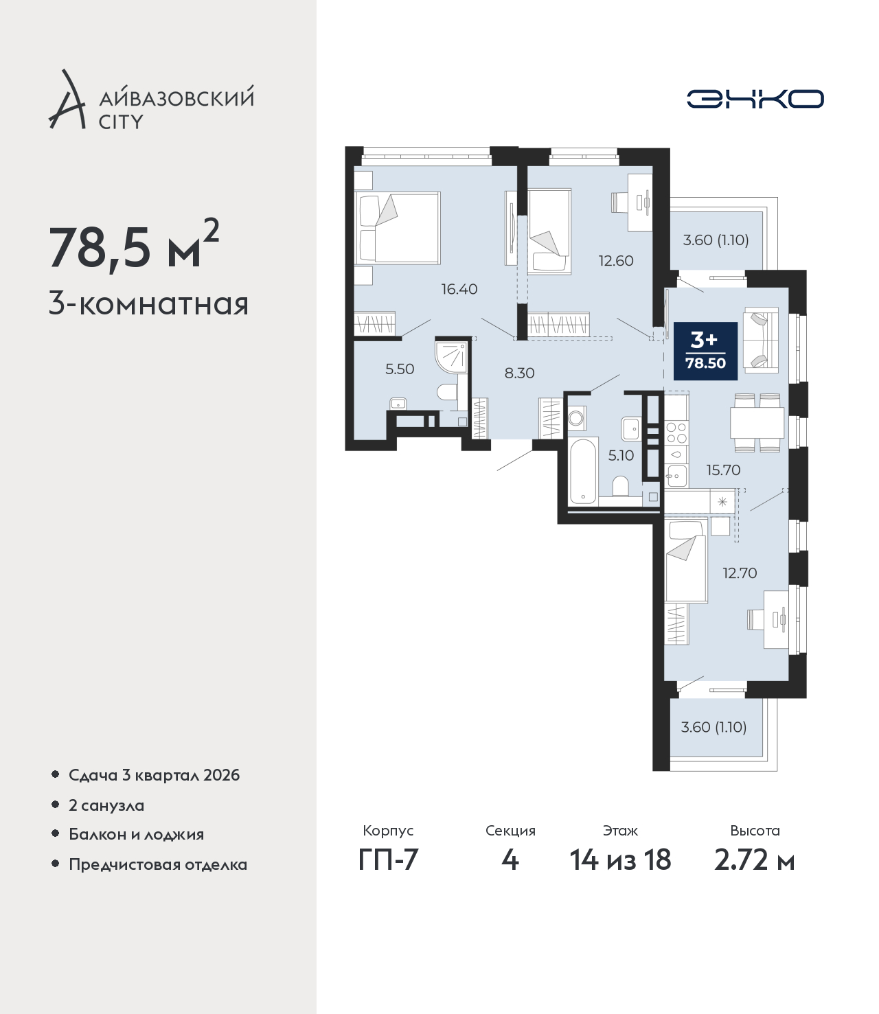 3-комн. квартира с предчистовой отделкой в ЖК "Айвазовский City" на 14 этаже. Общая площадь: 78.5 кв.м., жилая: 41.7 кв.м., площадь просторной кухни-столовой: 15.7 кв.м. Квартира без проходных комнат, окна выходят нa три cтopoны дома. В квартире один балкон и одна лоджия, два совмещенных санузла. Высота потолков 2.72 м. Дом монолитный, многоподъездный, переменной этажности, от 9 до 24 этажей. Квартира находится в 4-й секции высотой 18 этажей в корпусе ГП-7. На этаже 5 квартир. В подъезде 1 пассажирский и 2 грузовых лифта. Окончание строительства - 3 квартал 2026 года. Оформление сделки по договору долевого участия. Новый жилой район располагается в живописном месте на берегу Туры в центральной части города. Принципиально новое пространство для жизни в центре современного города для тех, чьи мечты сбываются, кто нацелен на постоянный рост, перемены к лучшему для себя и своих близких. Каждая деталь Айвазовский City вдохновляет и заряжает на новые свершения: авторская архитектура, сбалансированная продуманная инфраструктура, дизайнерские дворы со спортивными и детскими площадками, парковые зоны с фонтанами, водный канал, украшающий центральный прогулочный маршрут района и многое другое. В 2019 года проект стал лауреатом престижной премии Urban Awards 2019 в номинации «Лучший строящийся региональный жилой комплекс бизнес-класса». Главная особенность Айвазовский City - соседство разных архитектурных школ в рамках одного дома. Изысканная классика, выразительная эклектика и оригинальный модерн - жить в одном из таких домов настоящий повод для гордости. Айвазовский City это идеальное сочетание комфорта, технологий и развитой инфраструктуры. Вход в подъезд возможен с улицы и со двора. Отправляясь на работу или за покупками, жители могут выйти с внешней стороны дома, а для прогулки с ребенком – со стороны двора. Экологически чистые материалы и энергосберегающие технологии, качественное освещение общественных зон, видеонаблюдение по всей территории жилого района (в том числе в подъездах, лифтах и в подземном паркинге), закрытые дворы с доступом только для жителей Айвазовский City. Часть домов в Айвазовский City будут оснащены подземным паркингом. Востребованный в нашем климатическом поясе формат хранения автомобилей защитит собственность владельца в любое время года. Аккредитация в банках: ПАО «Газпромбанк», ПАО Банк «ВТБ», ОАО «Альфа-Банк», «Сбербанк России», ПАО Банк «ФК Открытие» и других. (AQID02526553)