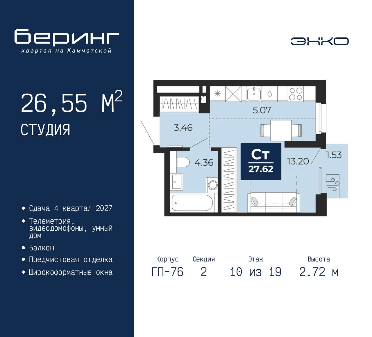 Однокомнатная квартира-студия с предчистовой отделкой в ЖК "Беринг" на 10 этаже. Общая площадь: 26.55 кв.м., площадь гостиной 18.27 кв.м., из которых 5.07 кв.м. выделено под кухонную зону. Все окна выходят на одну сторону. В квартире один балкон, один совмещенный санузел. Высота потолков 2.72 м. Дом монолитный, черырехподъездный, переменной этажности, от 19 до 24 этажей. Квартира находится во 2-й секции высотой 19 этажей в корпусе ГП-76. На этаже 8 квартир. В подъезде 1 пассажирский и 1 грузовой лифт. Окончание строительства - 4 квартал 2027 года. Оформление сделки по договору долевого участия. Подобно знаменитому исследователю, мы чувствуем себя первооткрывателями этой локации. Хотим показать новую суть места, сформировать для вас жизненный опыт, которого ещё не было. Беринг — район зелёного цвета. Беринг — район, который откроется вам с другой стороны. Впечатлит новым уровнем комфорта и качеством жизни. Беринг — открытие на карте города. Первый квартал расположен в районе Тура, в границах улиц: Камчатская – Западносибирская – Энтузиастов. Вокруг уже есть всё для того, чтобы ежедневная рутина была лишь частью жизни и не доставляла дискомфорта. Школы и детские сады, магазины и аптеки, поликлиника, места для семейного отдыха, пеших и велопрогулок, и даже рыбалки. Масштабное озеленение дворов — визитная карточка ЭНКО и ваш оазис спокойствия, чтобы отвлечься от повседневности. Раскидистые деревья, кустарники, травы и цветы — осталось остановиться, вдохнуть и расслабиться, глядя на эту природную красоту. Стилистика подъездов продолжает концепцию Беринга, вдохновлённого Камчаткой: сдержанный, но при этом впечатляющий дизайн соседствует с удобством и функциональностью. (AQID02518112)