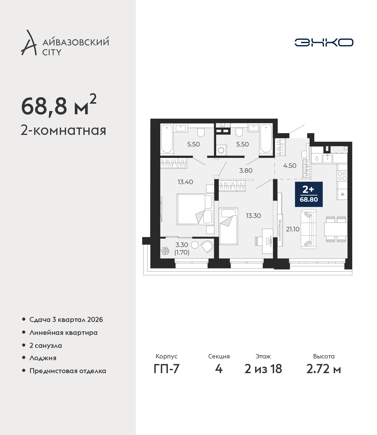 Продается 2-комн. квартира от застройщика с предчистовой отделкой в ЖК "Айвазовский City" на 2 этаже. Общая площадь: 68.8 кв.м., жилая: 26.7 кв.м., площадь просторной кухни-столовой: 21.1 кв.м. Комнаты изолированные, все окна выходят на одну сторону. В квартире одна лоджия, два совмещенных санузла. Высота потолков 2.72 м. Дом монолитный, многоподъездный, переменной этажности, от 9 до 24 этажей. Квартира находится в 4-й секции высотой 18 этажей в корпусе ГП-7. На этаже 5 квартир. В подъезде 1 пассажирский и 2 грузовых лифта. Окончание строительства - 3 квартал 2026 года. Оформление сделки по договору долевого участия. Новый жилой район располагается в живописном месте на берегу Туры в центральной части города. Принципиально новое пространство для жизни в центре современного города для тех, чьи мечты сбываются, кто нацелен на постоянный рост, перемены к лучшему для себя и своих близких. Каждая деталь Айвазовский City вдохновляет и заряжает на новые свершения: авторская архитектура, сбалансированная продуманная инфраструктура, дизайнерские дворы со спортивными и детскими площадками, парковые зоны с фонтанами, водный канал, украшающий центральный прогулочный маршрут района и многое другое. В 2019 года проект стал лауреатом престижной премии Urban Awards 2019 в номинации «Лучший строящийся региональный жилой комплекс бизнес-класса». Главная особенность Айвазовский City - соседство разных архитектурных школ в рамках одного дома. Изысканная классика, выразительная эклектика и оригинальный модерн - жить в одном из таких домов настоящий повод для гордости. Айвазовский City это идеальное сочетание комфорта, технологий и развитой инфраструктуры. Вход в подъезд возможен с улицы и со двора. Отправляясь на работу или за покупками, жители могут выйти с внешней стороны дома, а для прогулки с ребенком – со стороны двора. Экологически чистые материалы и энергосберегающие технологии, качественное освещение общественных зон, видеонаблюдение по всей территории жилого района (в том числе в подъездах, лифтах и в подземном паркинге), закрытые дворы с доступом только для жителей Айвазовский City. Часть домов в Айвазовский City будут оснащены подземным паркингом. Востребованный в нашем климатическом поясе формат хранения автомобилей защитит собственность владельца в любое время года. Аккредитация в банках: ПАО «Газпромбанк», ПАО Банк «ВТБ», «Сбербанк России», ОАО «Альфа-Банк», ПАО АКБ «Абсолют Банк» и других. (AQID02343176)