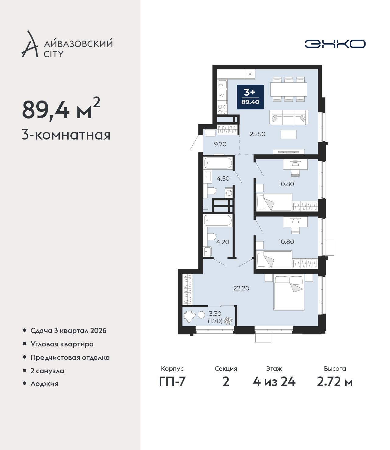 Трехкомнатная квартира с предчистовой отделкой в ЖК "Айвазовский City" на 4 этаже. Общая площадь: 89.4 кв.м., жилая: 43.8 кв.м., площадь просторной кухни-столовой: 25.5 кв.м. Квартира угловая, идеально подойдет любителям тишины и панорамных видов. В квартире одна лоджия, два совмещенных санузла. Высота потолков 2.72 м. Дом монолитный, многоподъездный, переменной этажности, от 9 до 24 этажей. Квартира находится во 2-й секции высотой 24 этажа в корпусе ГП-7. На этаже 7 квартир. В подъезде 1 пассажирский и 2 грузовых лифта. Окончание строительства - 3 квартал 2026 года. Оформление сделки по договору долевого участия. Новый жилой район располагается в живописном месте на берегу Туры в центральной части города. Принципиально новое пространство для жизни в центре современного города для тех, чьи мечты сбываются, кто нацелен на постоянный рост, перемены к лучшему для себя и своих близких. Каждая деталь Айвазовский City вдохновляет и заряжает на новые свершения: авторская архитектура, сбалансированная продуманная инфраструктура, дизайнерские дворы со спортивными и детскими площадками, парковые зоны с фонтанами, водный канал, украшающий центральный прогулочный маршрут района и многое другое. В 2019 года проект стал лауреатом престижной премии Urban Awards 2019 в номинации «Лучший строящийся региональный жилой комплекс бизнес-класса». Главная особенность Айвазовский City - соседство разных архитектурных школ в рамках одного дома. Изысканная классика, выразительная эклектика и оригинальный модерн - жить в одном из таких домов настоящий повод для гордости. Айвазовский City это идеальное сочетание комфорта, технологий и развитой инфраструктуры. Вход в подъезд возможен с улицы и со двора. Отправляясь на работу или за покупками, жители могут выйти с внешней стороны дома, а для прогулки с ребенком – со стороны двора. Экологически чистые материалы и энергосберегающие технологии, качественное освещение общественных зон, видеонаблюдение по всей территории жилого района (в том числе в подъездах, лифтах и в подземном паркинге), закрытые дворы с доступом только для жителей Айвазовский City. Часть домов в Айвазовский City будут оснащены подземным паркингом. Востребованный в нашем климатическом поясе формат хранения автомобилей защитит собственность владельца в любое время года. Аккредитация в банках: «Сбербанк России», ОАО «Альфа-Банк», ПАО Банк «ВТБ», ПАО «Газпромбанк», ПАО «Промсвязьбанк» и других. (AQID02487915)
