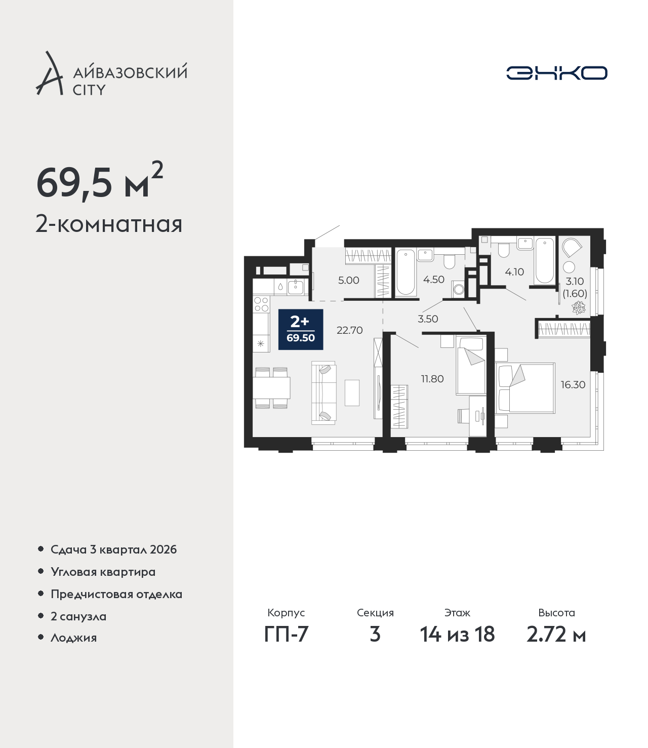 - Общая площадь 69.5 м²