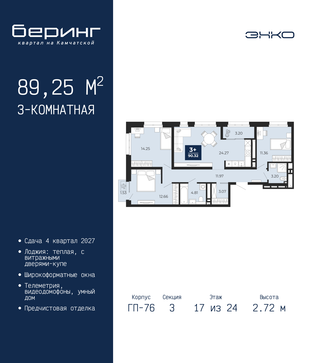 3-комн. квартира с предчистовой отделкой в ЖК "Беринг" на 17 этаже. Общая площадь: 89.25 кв.м., жилая: 38.27 кв.м., площадь просторной кухни-столовой: 24.27 кв.м. Угловая квартира, очень светлая, естественная вентиляция при открытии окон. В квартире один балкон и одна лоджия, два совмещенных санузла. Высота потолков 2.72 м. Дом монолитный, черырехподъездный, переменной этажности, от 19 до 24 этажей. Квартира находится в 3-й секции высотой 24 этажа в корпусе ГП-76. На этаже 6 квартир. В подъезде 1 пассажирский и 1 грузовой лифт. Окончание строительства - 4 квартал 2027 года. Оформление сделки по договору долевого участия. Подобно знаменитому исследователю, мы чувствуем себя первооткрывателями этой локации. Хотим показать новую суть места, сформировать для вас жизненный опыт, которого ещё не было. Беринг — район зелёного цвета. Беринг — район, который откроется вам с другой стороны. Впечатлит новым уровнем комфорта и качеством жизни. Беринг — открытие на карте города. Первый квартал расположен в районе Тура, в границах улиц: Камчатская – Западносибирская – Энтузиастов. Вокруг уже есть всё для того, чтобы ежедневная рутина была лишь частью жизни и не доставляла дискомфорта. Школы и детские сады, магазины и аптеки, поликлиника, места для семейного отдыха, пеших и велопрогулок, и даже рыбалки. Масштабное озеленение дворов — визитная карточка ЭНКО и ваш оазис спокойствия, чтобы отвлечься от повседневности. Раскидистые деревья, кустарники, травы и цветы — осталось остановиться, вдохнуть и расслабиться, глядя на эту природную красоту. Стилистика подъездов продолжает концепцию Беринга, вдохновлённого Камчаткой: сдержанный, но при этом впечатляющий дизайн соседствует с удобством и функциональностью. (AQID02529348)