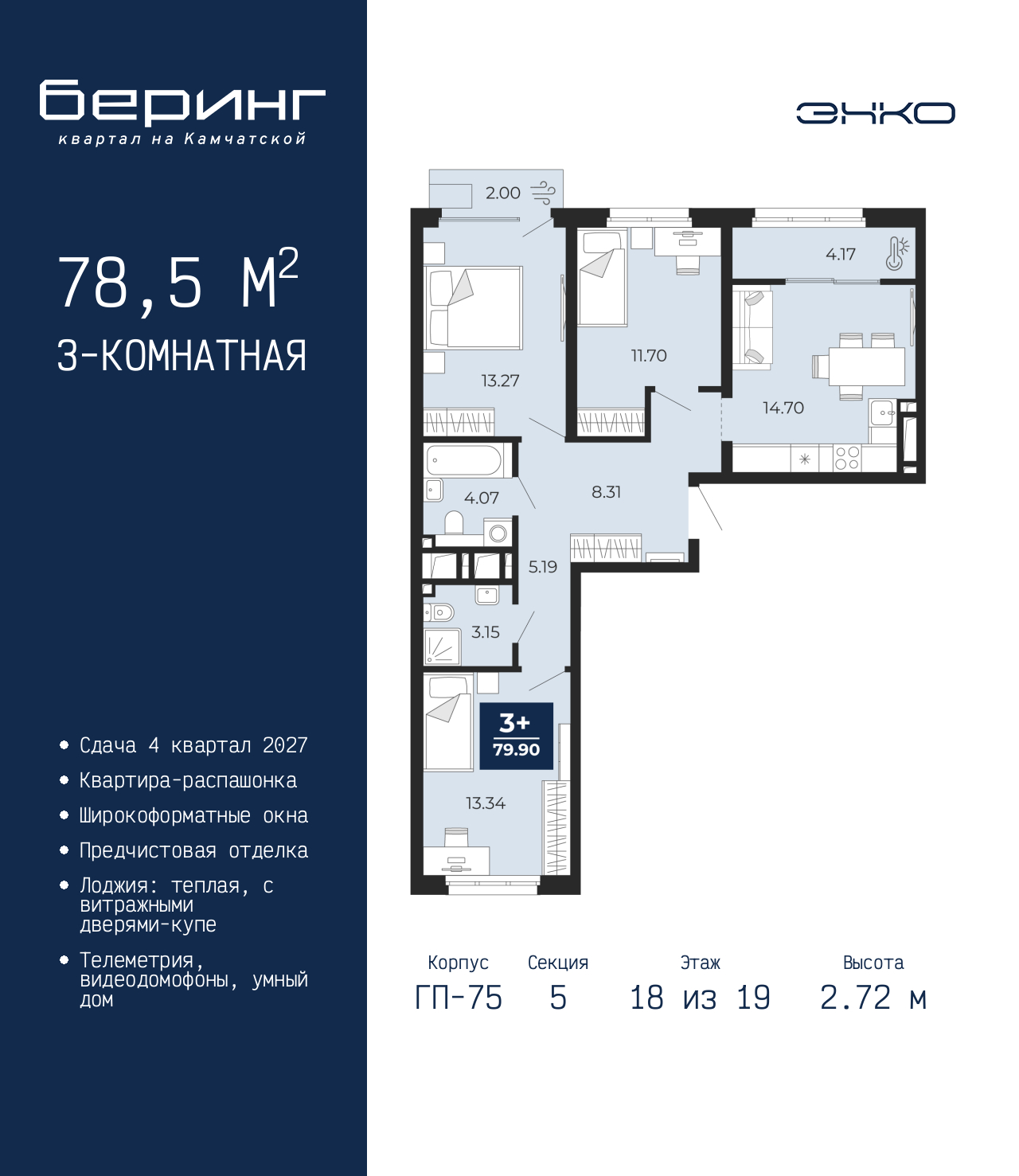 Квартира 3-комн., 79 м2, 18/19 этаж,