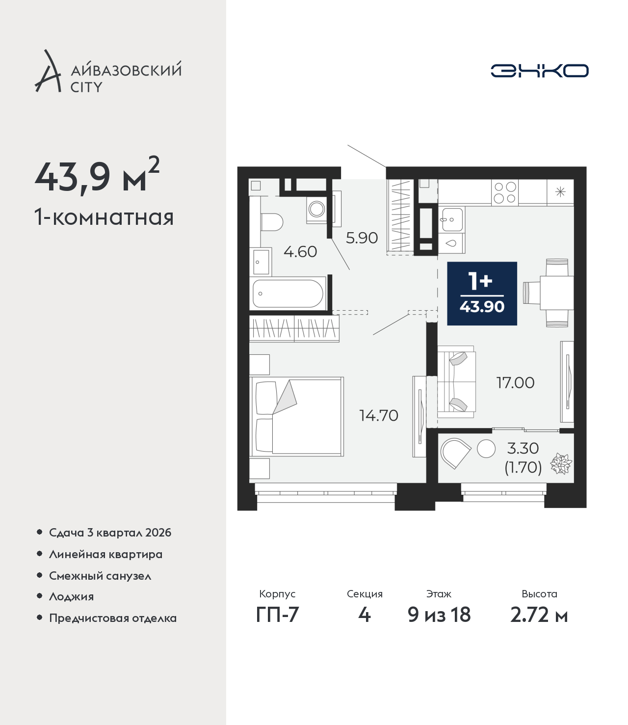 Продается однокомнатная квартира с предчистовой отделкой в ЖК "Айвазовский City" на 9 этаже. Общая площадь: 43.9 кв.м., жилая: 14.7 кв.м., площадь просторной кухни-столовой: 17 кв.м. Все окна выходят на одну сторону. В квартире одна лоджия, один совмещенный санузел. Высота потолков 2.72 м. Дом монолитный, многоподъездный, переменной этажности, от 9 до 24 этажей. Квартира находится в 4-й секции высотой 18 этажей в корпусе ГП-7. На этаже 5 квартир. В подъезде 1 пассажирский и 2 грузовых лифта. Окончание строительства - 3 квартал 2026 года. Оформление сделки по договору долевого участия. Новый жилой район располагается в живописном месте на берегу Туры в центральной части города. Принципиально новое пространство для жизни в центре современного города для тех, чьи мечты сбываются, кто нацелен на постоянный рост, перемены к лучшему для себя и своих близких. Каждая деталь Айвазовский City вдохновляет и заряжает на новые свершения: авторская архитектура, сбалансированная продуманная инфраструктура, дизайнерские дворы со спортивными и детскими площадками, парковые зоны с фонтанами, водный канал, украшающий центральный прогулочный маршрут района и многое другое. В 2019 года проект стал лауреатом престижной премии Urban Awards 2019 в номинации «Лучший строящийся региональный жилой комплекс бизнес-класса». Главная особенность Айвазовский City - соседство разных архитектурных школ в рамках одного дома. Изысканная классика, выразительная эклектика и оригинальный модерн - жить в одном из таких домов настоящий повод для гордости. Айвазовский City это идеальное сочетание комфорта, технологий и развитой инфраструктуры. Вход в подъезд возможен с улицы и со двора. Отправляясь на работу или за покупками, жители могут выйти с внешней стороны дома, а для прогулки с ребенком – со стороны двора. Экологически чистые материалы и энергосберегающие технологии, качественное освещение общественных зон, видеонаблюдение по всей территории жилого района (в том числе в подъездах, лифтах и в подземном паркинге), закрытые дворы с доступом только для жителей Айвазовский City. Часть домов в Айвазовский City будут оснащены подземным паркингом. Востребованный в нашем климатическом поясе формат хранения автомобилей защитит собственность владельца в любое время года. Аккредитация в банках: ПАО «Газпромбанк», «Сбербанк России», ОАО «Альфа-Банк», ПАО Банк «ВТБ», ПАО «Совкомбанк» и других. (AQID02343149)