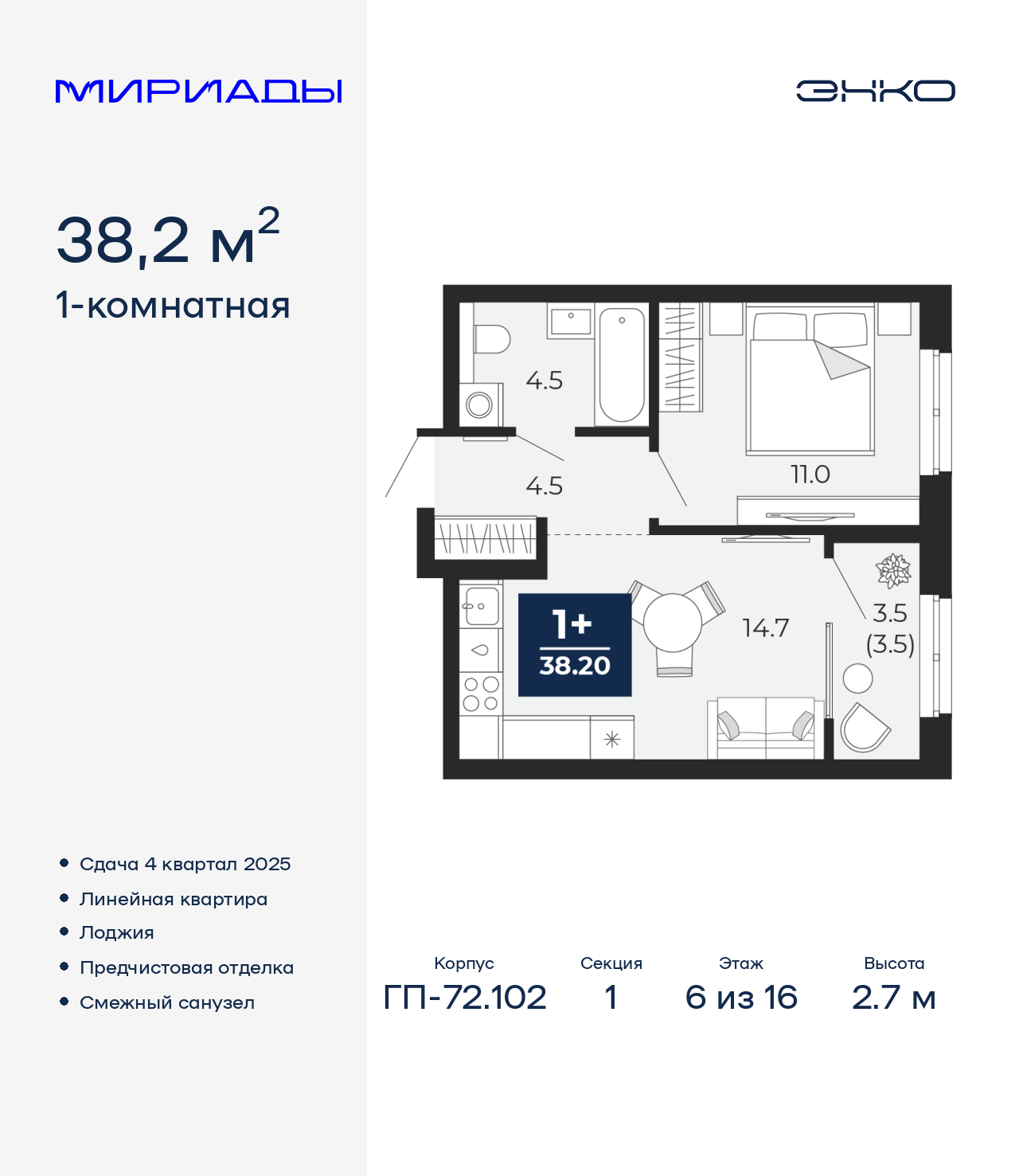 1-комн. квартира с предчистовой отделкой в ЖК "Мириады" на 6 этаже. Общая площадь: 38.2 кв.м., жилая: 11 кв.м., площадь просторной кухни-столовой: 14.7 кв.м. Все окна выходят на одну сторону. В квартире одна лоджия, один совмещенный санузел. Высота потолков 2.7 м. Дом монолитный, многоподъездный, переменной этажности, от 14 до 16 этажей. Квартира находится в 1-й секции высотой 16 этажей в корпусе ГП-72.102. На этаже 9 квартир. В подъезде 1 пассажирский и 1 грузовой лифт. Окончание строительства - 4 квартал 2025 года. Оформление сделки по договору долевого участия. Вселенная бесконечных историй. Ранее невиданный Тюмени масштаб: территория 240 гектаров и 1 650 000 м² застройки. Мириады – это город масштабных перемен и больших возможностей. Город зеленых рощ и зеркальных озер. Город для работы, учебы и развлечений. Город для детей и их родителей. Город для всех и каждого. Проект расположен в районе Мыс рядом с ТРЦ «Тюмень Сити Молл» в границах улицы Тимофея Чаркова, Тобольского тракта и объездной дороги. Срок полного освоения территории - до 2034 года. (AQID02522587)