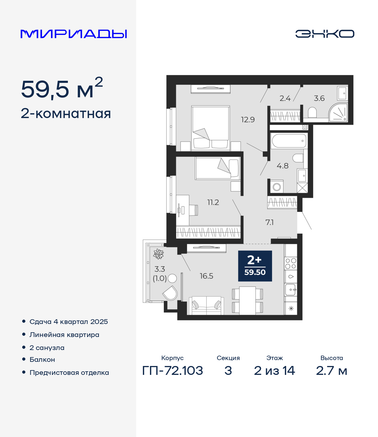 Продается двухкомнатная квартира с предчистовой отделкой в ЖК "Мириады" на 2 этаже. Общая площадь: 59.5 кв.м., жилая: 24.1 кв.м., площадь просторной кухни-столовой: 16.5 кв.м. Комнаты изолированные, все окна выходят на одну сторону. В квартире один балкон, два совмещенных санузла. Высота потолков 2.7 м. Дом монолитный, трехподъездный, переменной этажности, от 14 до 16 этажей. Квартира находится в 3-й секции высотой 14 этажей в корпусе ГП-72.103. На этаже 8 квартир. В подъезде 1 пассажирский и 1 грузовой лифт. Окончание строительства - 4 квартал 2025 года. Оформление сделки по договору долевого участия. Вселенная бесконечных историй. Ранее невиданный Тюмени масштаб: территория 240 гектаров и 1 650 000 м² застройки. Мириады – это город масштабных перемен и больших возможностей. Город зеленых рощ и зеркальных озер. Город для работы, учебы и развлечений. Город для детей и их родителей. Город для всех и каждого. Проект расположен в районе Мыс рядом с ТРЦ «Тюмень Сити Молл» в границах улицы Тимофея Чаркова, Тобольского тракта и объездной дороги. Срок полного освоения территории - до 2034 года. (AQID02522692)