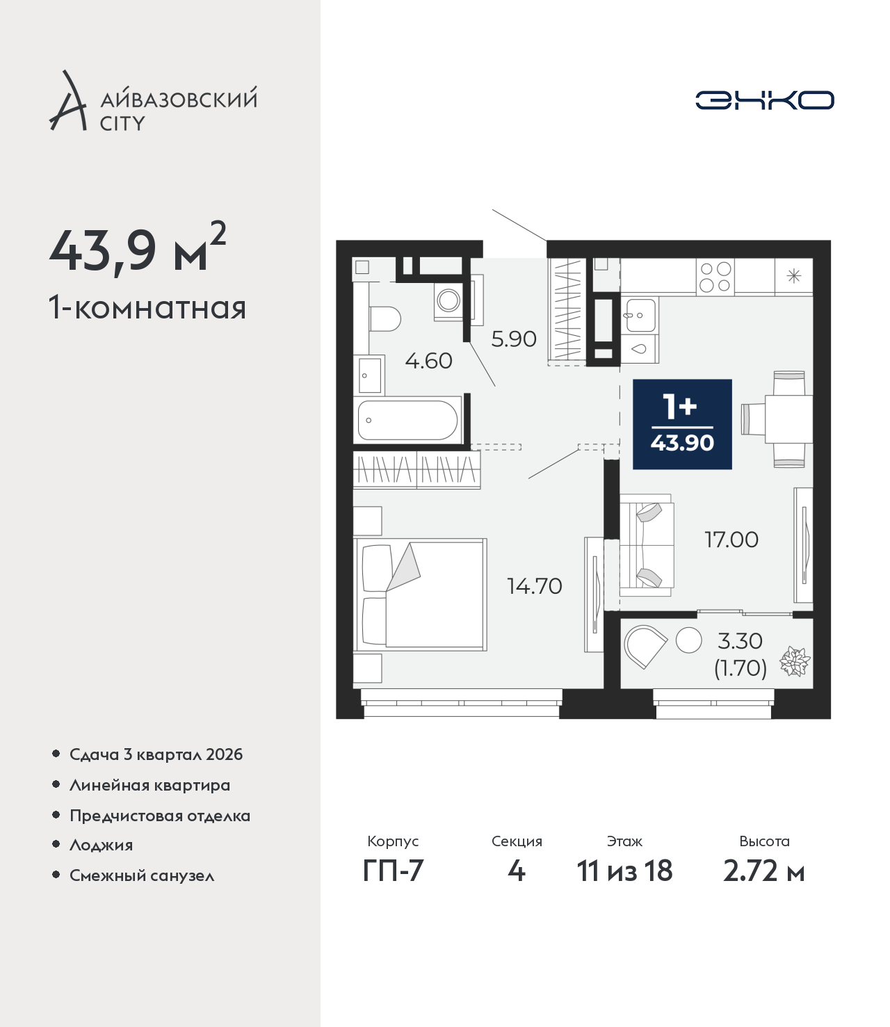 Продается 1-комн. квартира от застройщика с предчистовой отделкой в ЖК "Айвазовский City" на 11 этаже. Общая площадь: 43.9 кв.м., жилая: 14.7 кв.м., площадь просторной кухни-столовой: 17 кв.м. Все окна выходят на одну сторону. В квартире одна лоджия, один совмещенный санузел. Высота потолков 2.72 м. Дом монолитный, многоподъездный, переменной этажности, от 9 до 24 этажей. Квартира находится в 4-й секции высотой 18 этажей в корпусе ГП-7. На этаже 5 квартир. В подъезде 1 пассажирский и 2 грузовых лифта. Окончание строительства - 3 квартал 2026 года. Оформление сделки по договору долевого участия. Новый жилой район располагается в живописном месте на берегу Туры в центральной части города. Принципиально новое пространство для жизни в центре современного города для тех, чьи мечты сбываются, кто нацелен на постоянный рост, перемены к лучшему для себя и своих близких. Каждая деталь Айвазовский City вдохновляет и заряжает на новые свершения: авторская архитектура, сбалансированная продуманная инфраструктура, дизайнерские дворы со спортивными и детскими площадками, парковые зоны с фонтанами, водный канал, украшающий центральный прогулочный маршрут района и многое другое. В 2019 года проект стал лауреатом престижной премии Urban Awards 2019 в номинации «Лучший строящийся региональный жилой комплекс бизнес-класса». Главная особенность Айвазовский City - соседство разных архитектурных школ в рамках одного дома. Изысканная классика, выразительная эклектика и оригинальный модерн - жить в одном из таких домов настоящий повод для гордости. Айвазовский City это идеальное сочетание комфорта, технологий и развитой инфраструктуры. Вход в подъезд возможен с улицы и со двора. Отправляясь на работу или за покупками, жители могут выйти с внешней стороны дома, а для прогулки с ребенком – со стороны двора. Экологически чистые материалы и энергосберегающие технологии, качественное освещение общественных зон, видеонаблюдение по всей территории жилого района (в том числе в подъездах, лифтах и в подземном паркинге), закрытые дворы с доступом только для жителей Айвазовский City. Часть домов в Айвазовский City будут оснащены подземным паркингом. Востребованный в нашем климатическом поясе формат хранения автомобилей защитит собственность владельца в любое время года. Аккредитация в банках: ОАО «Альфа-Банк», «Сбербанк России», ПАО Банк «ВТБ», ПАО «Газпромбанк», ПАО «Промсвязьбанк» и других. (AQID02497759)