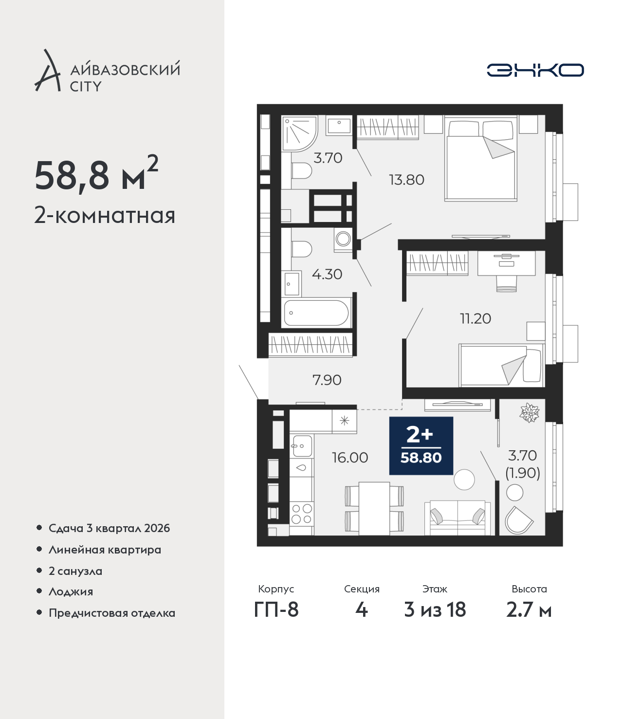 Двухкомнатная квартира с предчистовой отделкой в ЖК "Айвазовский City" на 3 этаже. Общая площадь: 58.8 кв.м., жилая: 25 кв.м., площадь просторной кухни-столовой: 16 кв.м. Комнаты изолированные, все окна выходят на одну сторону. В квартире одна лоджия, два совмещенных санузла. Высота потолков 2.7 м. Дом монолитный, многоподъездный, переменной этажности, от 14 до 24 этажей. Квартира находится в 4-й секции высотой 18 этажей в корпусе ГП-8. На этаже 6 квартир. В подъезде 1 пассажирский и 1 грузовой лифт. Окончание строительства - 3 квартал 2026 года. Оформление сделки по договору долевого участия. Новый жилой район располагается в живописном месте на берегу Туры в центральной части города. Принципиально новое пространство для жизни в центре современного города для тех, чьи мечты сбываются, кто нацелен на постоянный рост, перемены к лучшему для себя и своих близких. Каждая деталь Айвазовский City вдохновляет и заряжает на новые свершения: авторская архитектура, сбалансированная продуманная инфраструктура, дизайнерские дворы со спортивными и детскими площадками, парковые зоны с фонтанами, водный канал, украшающий центральный прогулочный маршрут района и многое другое. В 2019 года проект стал лауреатом престижной премии Urban Awards 2019 в номинации «Лучший строящийся региональный жилой комплекс бизнес-класса». Главная особенность Айвазовский City - соседство разных архитектурных школ в рамках одного дома. Изысканная классика, выразительная эклектика и оригинальный модерн - жить в одном из таких домов настоящий повод для гордости. Айвазовский City это идеальное сочетание комфорта, технологий и развитой инфраструктуры. Вход в подъезд возможен с улицы и со двора. Отправляясь на работу или за покупками, жители могут выйти с внешней стороны дома, а для прогулки с ребенком – со стороны двора. Экологически чистые материалы и энергосберегающие технологии, качественное освещение общественных зон, видеонаблюдение по всей территории жилого района (в том числе в подъездах, лифтах и в подземном паркинге), закрытые дворы с доступом только для жителей Айвазовский City. Часть домов в Айвазовский City будут оснащены подземным паркингом. Востребованный в нашем климатическом поясе формат хранения автомобилей защитит собственность владельца в любое время года. Аккредитация в банках: ПАО «Газпромбанк», ОАО «Альфа-Банк», «Сбербанк России», ПАО Банк «ВТБ», ПАО «Промсвязьбанк» и других. (AQID02514888)