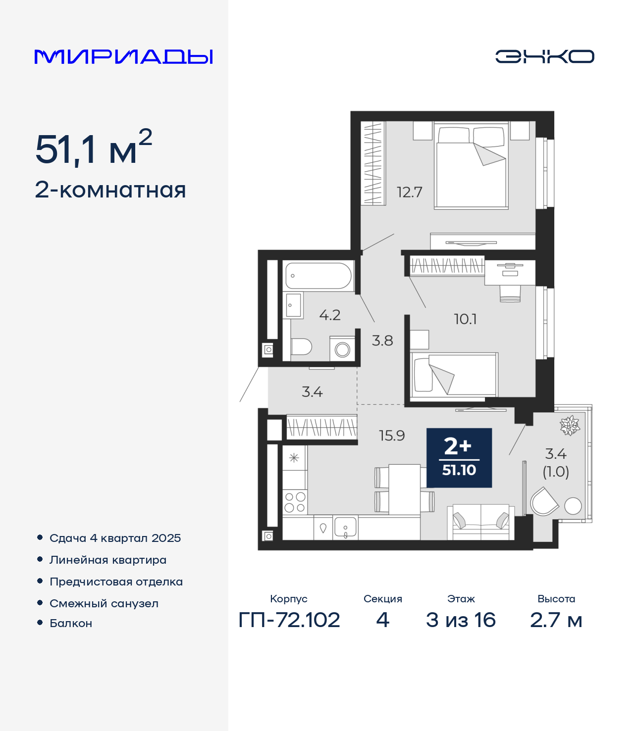 Двухкомнатная квартира от застройщика с предчистовой отделкой в ЖК "Мириады" на 3 этаже. Общая площадь: 51.1 кв.м., жилая: 22.8 кв.м., площадь просторной кухни-столовой: 15.9 кв.м. Комнаты изолированные, все окна выходят на одну сторону. В квартире один балкон, один совмещенный санузел. Высота потолков 2.7 м. Дом монолитный, многоподъездный, переменной этажности, от 14 до 16 этажей. Квартира находится в 4-й секции высотой 16 этажей в корпусе ГП-72.102. На этаже 6 квартир. В подъезде 1 пассажирский и 1 грузовой лифт. Окончание строительства - 4 квартал 2025 года. Оформление сделки по договору долевого участия. Вселенная бесконечных историй. Ранее невиданный Тюмени масштаб: территория 240 гектаров и 1 650 000 м² застройки. Мириады – это город масштабных перемен и больших возможностей. Город зеленых рощ и зеркальных озер. Город для работы, учебы и развлечений. Город для детей и их родителей. Город для всех и каждого. Проект расположен в районе Мыс рядом с ТРЦ «Тюмень Сити Молл» в границах улицы Тимофея Чаркова, Тобольского тракта и объездной дороги. Срок полного освоения территории - до 2034 года. (AQID02522658)