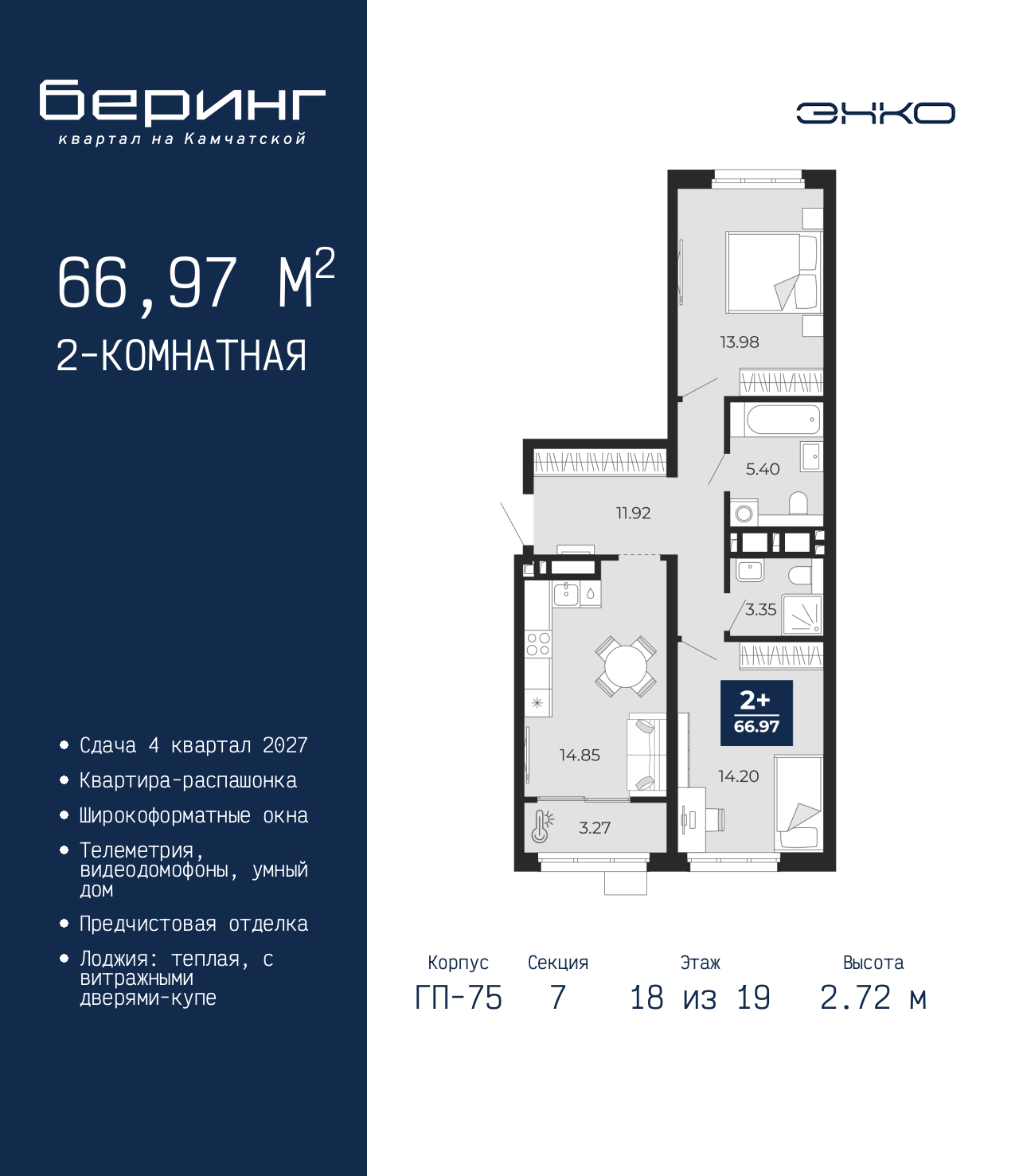 Двухкомнатная квартира от застройщика с предчистовой отделкой в ЖК "Беринг" на 18 этаже. Общая площадь: 66.97 кв.м., жилая: 28.18 кв.м., площадь просторной кухни-столовой: 14.85 кв.м. Квартира - распашонка, без проходных комнат, окна выходят на paзные стороны дома. В квартире одна лоджия, два совмещенных санузла. Высота потолков 2.72 м. Дом монолитный, многоподъездный, переменной этажности, от 17 до 24 этажей. Квартира находится в 7-й секции высотой 19 этажей в корпусе ГП-75. На этаже 7 квартир. В подъезде 2 пассажирских и 1 грузовой лифт. Окончание строительства - 4 квартал 2027 года. Оформление сделки по договору долевого участия. Подобно знаменитому исследователю, мы чувствуем себя первооткрывателями этой локации. Хотим показать новую суть места, сформировать для вас жизненный опыт, которого ещё не было. Беринг — район зелёного цвета. Беринг — район, который откроется вам с другой стороны. Впечатлит новым уровнем комфорта и качеством жизни. Беринг — открытие на карте города. Первый квартал расположен в районе Тура, в границах улиц: Камчатская – Западносибирская – Энтузиастов. Вокруг уже есть всё для того, чтобы ежедневная рутина была лишь частью жизни и не доставляла дискомфорта. Школы и детские сады, магазины и аптеки, поликлиника, места для семейного отдыха, пеших и велопрогулок, и даже рыбалки. Масштабное озеленение дворов — визитная карточка ЭНКО и ваш оазис спокойствия, чтобы отвлечься от повседневности. Раскидистые деревья, кустарники, травы и цветы — осталось остановиться, вдохнуть и расслабиться, глядя на эту природную красоту. Стилистика подъездов продолжает концепцию Беринга, вдохновлённого Камчаткой: сдержанный, но при этом впечатляющий дизайн соседствует с удобством и функциональностью. (AQID02529770)