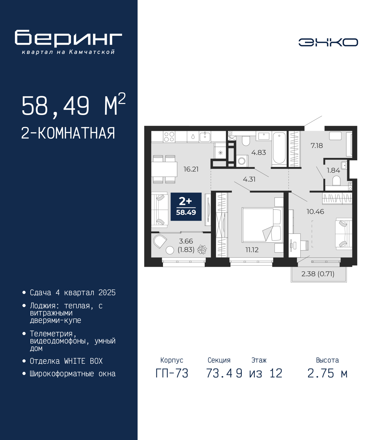 2-комн. квартира от застройщика с предчистовой отделкой в ЖК "Беринг" на 9 этаже. Общая площадь: 58.49 кв.м., жилая: 21.58 кв.м., площадь просторной кухни-столовой: 16.21 кв.м. Комнаты изолированные, все окна выходят на одну сторону. В квартире один балкон и одна лоджия, один совмещенный и один раздельный санузел. Высота потолков 2.75 м. Дом монолитный, многоподъездный, переменной этажности, от 9 до 22 этажей. Квартира находится в 73.4-й секции высотой 12 этажей в корпусе ГП-73. На этаже 8 квартир. В подъезде 1 пассажирский и 1 грузовой лифт. Окончание строительства - 4 квартал 2025 года. Оформление сделки по договору долевого участия. Подобно знаменитому исследователю, мы чувствуем себя первооткрывателями этой локации. Хотим показать новую суть места, сформировать для вас жизненный опыт, которого ещё не было. Беринг — район зелёного цвета. Беринг — район, который откроется вам с другой стороны. Впечатлит новым уровнем комфорта и качеством жизни. Беринг — открытие на карте города. Первый квартал расположен в районе Тура, в границах улиц: Камчатская – Западносибирская – Энтузиастов. Вокруг уже есть всё для того, чтобы ежедневная рутина была лишь частью жизни и не доставляла дискомфорта. Школы и детские сады, магазины и аптеки, поликлиника, места для семейного отдыха, пеших и велопрогулок, и даже рыбалки. Масштабное озеленение дворов — визитная карточка ЭНКО и ваш оазис спокойствия, чтобы отвлечься от повседневности. Раскидистые деревья, кустарники, травы и цветы — осталось остановиться, вдохнуть и расслабиться, глядя на эту природную красоту. Стилистика подъездов продолжает концепцию Беринга, вдохновлённого Камчаткой: сдержанный, но при этом впечатляющий дизайн соседствует с удобством и функциональностью. (AQID02391850)