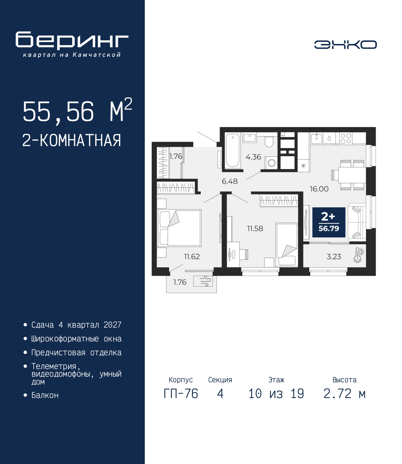 Просторная 2-комн. квартира с предчистовой отделкой в ЖК "Беринг" на 10 этаже. Общая площадь: 55.56 кв.м., жилая: 23.2 кв.м., площадь просторной кухни-столовой: 16 кв.м. Угловая квартира, окна oбecпeчивaют paвнoмepнoe ocвeщeниe в тeчeниe дня. В квартире один балкон, один совмещенный санузел. Высота потолков 2.72 м. Дом монолитный, черырехподъездный, переменной этажности, от 19 до 24 этажей. Квартира находится в 4-й секции высотой 19 этажей в корпусе ГП-76. На этаже 5 квартир. В подъезде 1 пассажирский и 1 грузовой лифт. Окончание строительства - 4 квартал 2027 года. Оформление сделки по договору долевого участия. Подобно знаменитому исследователю, мы чувствуем себя первооткрывателями этой локации. Хотим показать новую суть места, сформировать для вас жизненный опыт, которого ещё не было. Беринг — район зелёного цвета. Беринг — район, который откроется вам с другой стороны. Впечатлит новым уровнем комфорта и качеством жизни. Беринг — открытие на карте города. Первый квартал расположен в районе Тура, в границах улиц: Камчатская – Западносибирская – Энтузиастов. Вокруг уже есть всё для того, чтобы ежедневная рутина была лишь частью жизни и не доставляла дискомфорта. Школы и детские сады, магазины и аптеки, поликлиника, места для семейного отдыха, пеших и велопрогулок, и даже рыбалки. Масштабное озеленение дворов — визитная карточка ЭНКО и ваш оазис спокойствия, чтобы отвлечься от повседневности. Раскидистые деревья, кустарники, травы и цветы — осталось остановиться, вдохнуть и расслабиться, глядя на эту природную красоту. Стилистика подъездов продолжает концепцию Беринга, вдохновлённого Камчаткой: сдержанный, но при этом впечатляющий дизайн соседствует с удобством и функциональностью. (AQID02518340)