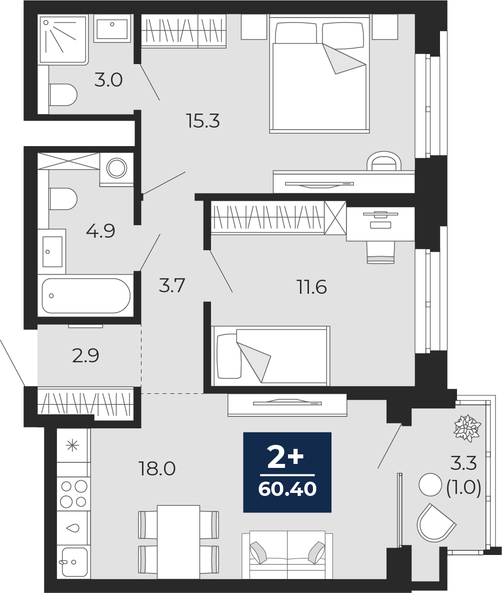 2-комн. квартира с предчистовой отделкой в ЖК "Мириады" на 8 этаже. Общая площадь: 60.4 кв.м., жилая: 26.9 кв.м., площадь просторной кухни-столовой: 18 кв.м. Комнаты изолированные, все окна выходят на одну сторону. В квартире один балкон, два совмещенных санузла. Высота потолков 2.7 м. Дом монолитный, двухподъездный, переменной этажности, от 14 до 18 этажей. Квартира находится во 2-й секции высотой 14 этажей в корпусе ГП-72.104. На этаже 8 квартир. В подъезде 1 пассажирский и 1 грузовой лифт. Окончание строительства - 4 квартал 2025 года. Оформление сделки по договору долевого участия. Вселенная бесконечных историй. Ранее невиданный Тюмени масштаб: территория 240 гектаров и 1 650 000 м² застройки. Мириады – это город масштабных перемен и больших возможностей. Город зеленых рощ и зеркальных озер. Город для работы, учебы и развлечений. Город для детей и их родителей. Город для всех и каждого. Проект расположен в районе Мыс рядом с ТРЦ «Тюмень Сити Молл» в границах улицы Тимофея Чаркова, Тобольского тракта и объездной дороги. Срок полного освоения территории - до 2034 года. (AQID02536570)