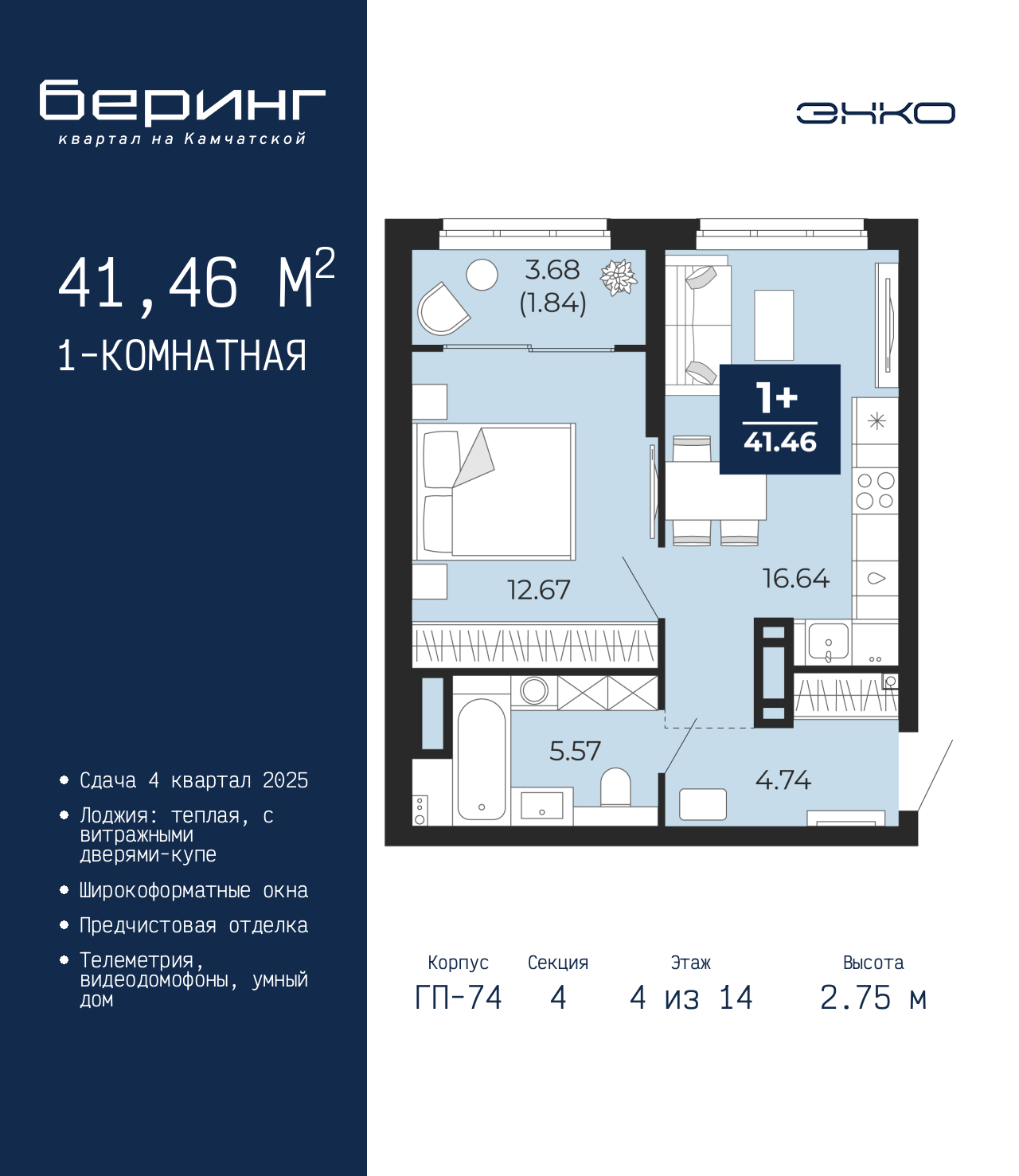 Однокомнатная квартира с предчистовой отделкой в ЖК "Беринг" на 4 этаже. Общая площадь: 41.46 кв.м., жилая: 12.67 кв.м., площадь просторной кухни-столовой: 16.64 кв.м. Все окна выходят на одну сторону. В квартире одна лоджия, один совмещенный санузел. Высота потолков 2.75 м. Дом монолитный, многоподъездный, переменной этажности, от 9 до 21 этажей. Квартира находится в 4-й секции высотой 14 этажей в корпусе ГП-74. На этаже 7 квартир. В подъезде 1 пассажирский и 1 грузовой лифт. Окончание строительства - 4 квартал 2025 года. Оформление сделки по договору долевого участия. Подобно знаменитому исследователю, мы чувствуем себя первооткрывателями этой локации. Хотим показать новую суть места, сформировать для вас жизненный опыт, которого ещё не было. Беринг — район зелёного цвета. Беринг — район, который откроется вам с другой стороны. Впечатлит новым уровнем комфорта и качеством жизни. Беринг — открытие на карте города. Первый квартал расположен в районе Тура, в границах улиц: Камчатская – Западносибирская – Энтузиастов. Вокруг уже есть всё для того, чтобы ежедневная рутина была лишь частью жизни и не доставляла дискомфорта. Школы и детские сады, магазины и аптеки, поликлиника, места для семейного отдыха, пеших и велопрогулок, и даже рыбалки. Масштабное озеленение дворов — визитная карточка ЭНКО и ваш оазис спокойствия, чтобы отвлечься от повседневности. Раскидистые деревья, кустарники, травы и цветы — осталось остановиться, вдохнуть и расслабиться, глядя на эту природную красоту. Стилистика подъездов продолжает концепцию Беринга, вдохновлённого Камчаткой: сдержанный, но при этом впечатляющий дизайн соседствует с удобством и функциональностью. (AQID02315810)