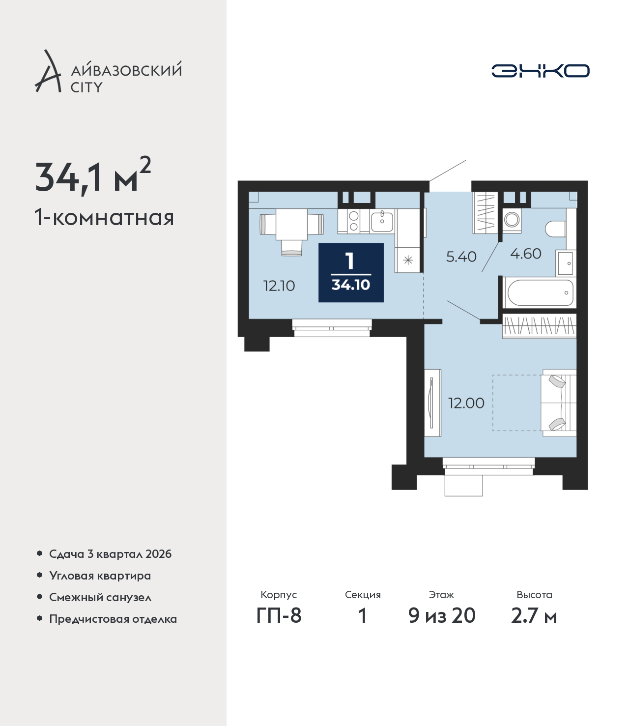 Однокомнатная квартира с предчистовой отделкой в ЖК "Айвазовский City" на 9 этаже. Общая площадь: 34.1 кв.м., жилая: 12 кв.м., площадь просторной кухни-столовой: 12.1 кв.м. Угловая квартира, окна oбecпeчивaют paвнoмepнoe ocвeщeниe в тeчeниe дня. В квартире один совмещенный санузел. Высота потолков 2.7 м. Дом монолитный, многоподъездный, переменной этажности, от 14 до 24 этажей. Квартира находится в 1-й секции высотой 20 этажей в корпусе ГП-8. На этаже 6 квартир. В подъезде 1 пассажирский и 1 грузовой лифт. Окончание строительства - 3 квартал 2026 года. Оформление сделки по договору долевого участия. Новый жилой район располагается в живописном месте на берегу Туры в центральной части города. Принципиально новое пространство для жизни в центре современного города для тех, чьи мечты сбываются, кто нацелен на постоянный рост, перемены к лучшему для себя и своих близких. Каждая деталь Айвазовский City вдохновляет и заряжает на новые свершения: авторская архитектура, сбалансированная продуманная инфраструктура, дизайнерские дворы со спортивными и детскими площадками, парковые зоны с фонтанами, водный канал, украшающий центральный прогулочный маршрут района и многое другое. В 2019 года проект стал лауреатом престижной премии Urban Awards 2019 в номинации «Лучший строящийся региональный жилой комплекс бизнес-класса». Главная особенность Айвазовский City - соседство разных архитектурных школ в рамках одного дома. Изысканная классика, выразительная эклектика и оригинальный модерн - жить в одном из таких домов настоящий повод для гордости. Айвазовский City это идеальное сочетание комфорта, технологий и развитой инфраструктуры. Вход в подъезд возможен с улицы и со двора. Отправляясь на работу или за покупками, жители могут выйти с внешней стороны дома, а для прогулки с ребенком – со стороны двора. Экологически чистые материалы и энергосберегающие технологии, качественное освещение общественных зон, видеонаблюдение по всей территории жилого района (в том числе в подъездах, лифтах и в подземном паркинге), закрытые дворы с доступом только для жителей Айвазовский City. Часть домов в Айвазовский City будут оснащены подземным паркингом. Востребованный в нашем климатическом поясе формат хранения автомобилей защитит собственность владельца в любое время года. Аккредитация в банках: ПАО Банк «ВТБ», ПАО «Газпромбанк», ОАО «Альфа-Банк», «Сбербанк России», ПАО Банк «ФК Открытие» и других. (AQID02459856)