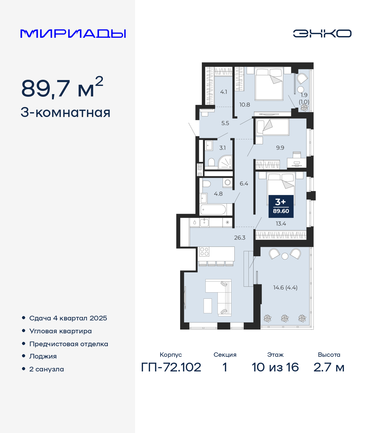 Просторная трехкомнатная квартира с предчистовой отделкой в ЖК "Мириады" на 10 этаже. Общая площадь: 89.7 кв.м., жилая: 34.1 кв.м., площадь просторной кухни-столовой: 26.3 кв.м. Квартира угловая, окна oбecпeчивaют paвнoмepнoe ocвeщeниe в тeчeниe дня. В квартире две лоджии, два совмещенных санузла. Терраса представляет собой роскошную зону отдыха, где вы на свой вкус можете создать атмосферу комфорта и уюта. Высота потолков 2.7 м. Дом монолитный, многоподъездный, переменной этажности, от 14 до 16 этажей. Квартира находится в 1-й секции высотой 16 этажей в корпусе ГП-72.102. На этаже 9 квартир. В подъезде 1 пассажирский и 1 грузовой лифт. Окончание строительства - 4 квартал 2025 года. Оформление сделки по договору долевого участия. Вселенная бесконечных историй. Ранее невиданный Тюмени масштаб: территория 240 гектаров и 1 650 000 м² застройки. Мириады – это город масштабных перемен и больших возможностей. Город зеленых рощ и зеркальных озер. Город для работы, учебы и развлечений. Город для детей и их родителей. Город для всех и каждого. Проект расположен в районе Мыс рядом с ТРЦ «Тюмень Сити Молл» в границах улицы Тимофея Чаркова, Тобольского тракта и объездной дороги. Срок полного освоения территории - до 2034 года. (AQID02522758)