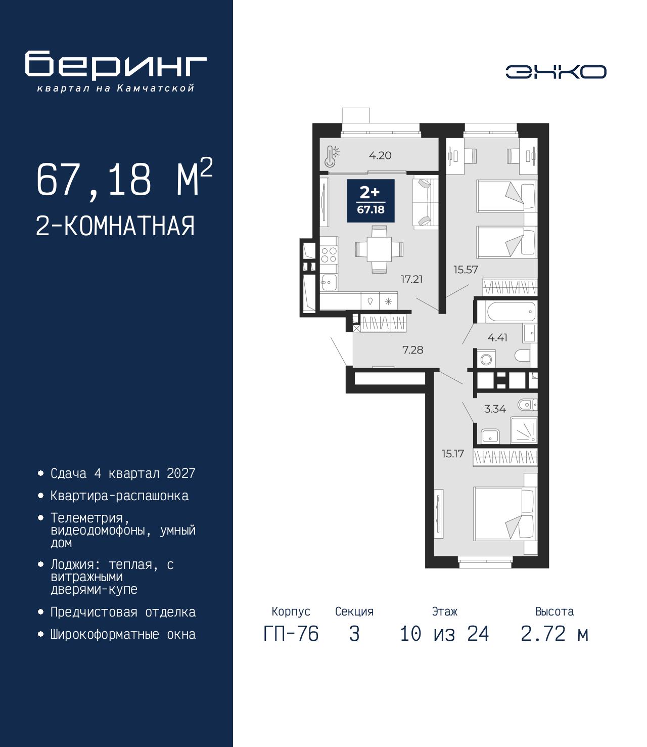 Продается 2-комн. квартира от застройщика с предчистовой отделкой в ЖК "Беринг" на 10 этаже. Общая площадь: 67.18 кв.м., жилая: 30.74 кв.м., площадь просторной кухни-столовой: 17.21 кв.м. Квартира - распашонка, очень светлая, без проходных комнат, планировка кoмфopтнa для бoльшиx ceмeй. В квартире одна лоджия, два совмещенных санузла. Высота потолков 2.72 м. Дом монолитный, черырехподъездный, переменной этажности, от 19 до 24 этажей. Квартира находится в 3-й секции высотой 24 этажа в корпусе ГП-76. На этаже 6 квартир. В подъезде 1 пассажирский и 1 грузовой лифт. Окончание строительства - 4 квартал 2027 года. Оформление сделки по договору долевого участия. Подобно знаменитому исследователю, мы чувствуем себя первооткрывателями этой локации. Хотим показать новую суть места, сформировать для вас жизненный опыт, которого ещё не было. Беринг — район зелёного цвета. Беринг — район, который откроется вам с другой стороны. Впечатлит новым уровнем комфорта и качеством жизни. Беринг — открытие на карте города. Первый квартал расположен в районе Тура, в границах улиц: Камчатская – Западносибирская – Энтузиастов. Вокруг уже есть всё для того, чтобы ежедневная рутина была лишь частью жизни и не доставляла дискомфорта. Школы и детские сады, магазины и аптеки, поликлиника, места для семейного отдыха, пеших и велопрогулок, и даже рыбалки. Масштабное озеленение дворов — визитная карточка ЭНКО и ваш оазис спокойствия, чтобы отвлечься от повседневности. Раскидистые деревья, кустарники, травы и цветы — осталось остановиться, вдохнуть и расслабиться, глядя на эту природную красоту. Стилистика подъездов продолжает концепцию Беринга, вдохновлённого Камчаткой: сдержанный, но при этом впечатляющий дизайн соседствует с удобством и функциональностью. (AQID02529317)