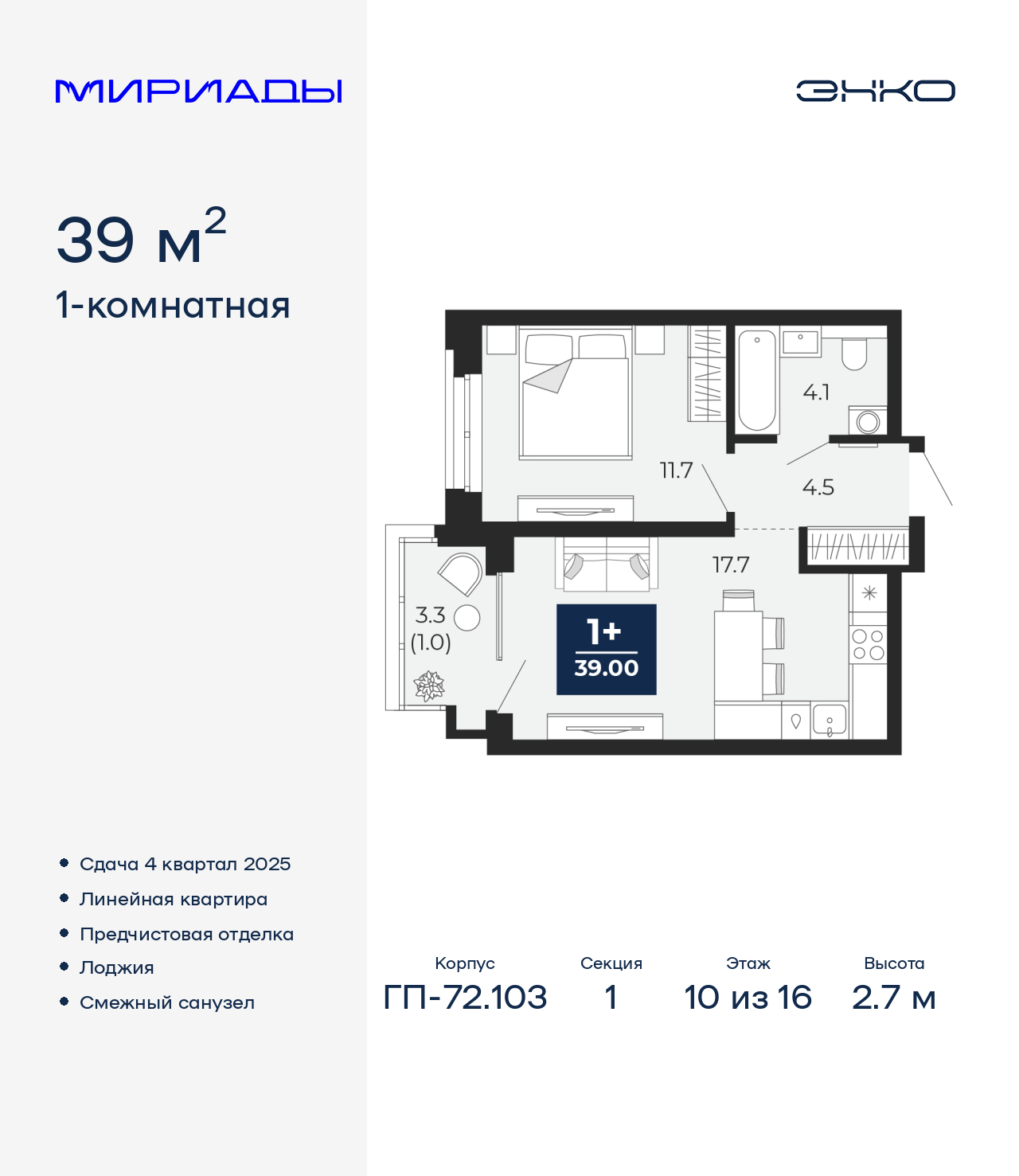 1-комн. квартира от застройщика с предчистовой отделкой в ЖК "Мириады" на 10 этаже. Общая площадь: 39 кв.м., жилая: 10.3 кв.м., площадь просторной кухни-столовой: 15.2 кв.м. Все окна выходят на одну сторону. В квартире одна лоджия, один совмещенный санузел. Высота потолков 2.7 м. Дом монолитный, трехподъездный, переменной этажности, от 14 до 16 этажей. Квартира находится в 1-й секции высотой 16 этажей в корпусе ГП-72.103. На этаже 8 квартир. В подъезде 1 пассажирский и 1 грузовой лифт. Окончание строительства - 4 квартал 2025 года. Оформление сделки по договору долевого участия. Вселенная бесконечных историй. Ранее невиданный Тюмени масштаб: территория 240 гектаров и 1 650 000 м² застройки. Мириады – это город масштабных перемен и больших возможностей. Город зеленых рощ и зеркальных озер. Город для работы, учебы и развлечений. Город для детей и их родителей. Город для всех и каждого. Проект расположен в районе Мыс рядом с ТРЦ «Тюмень Сити Молл» в границах улицы Тимофея Чаркова, Тобольского тракта и объездной дороги. Срок полного освоения территории - до 2034 года. (AQID02536590)